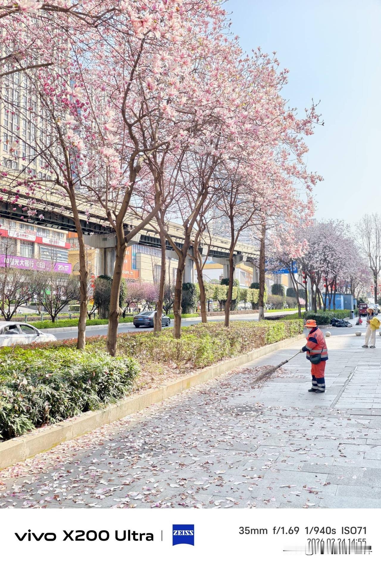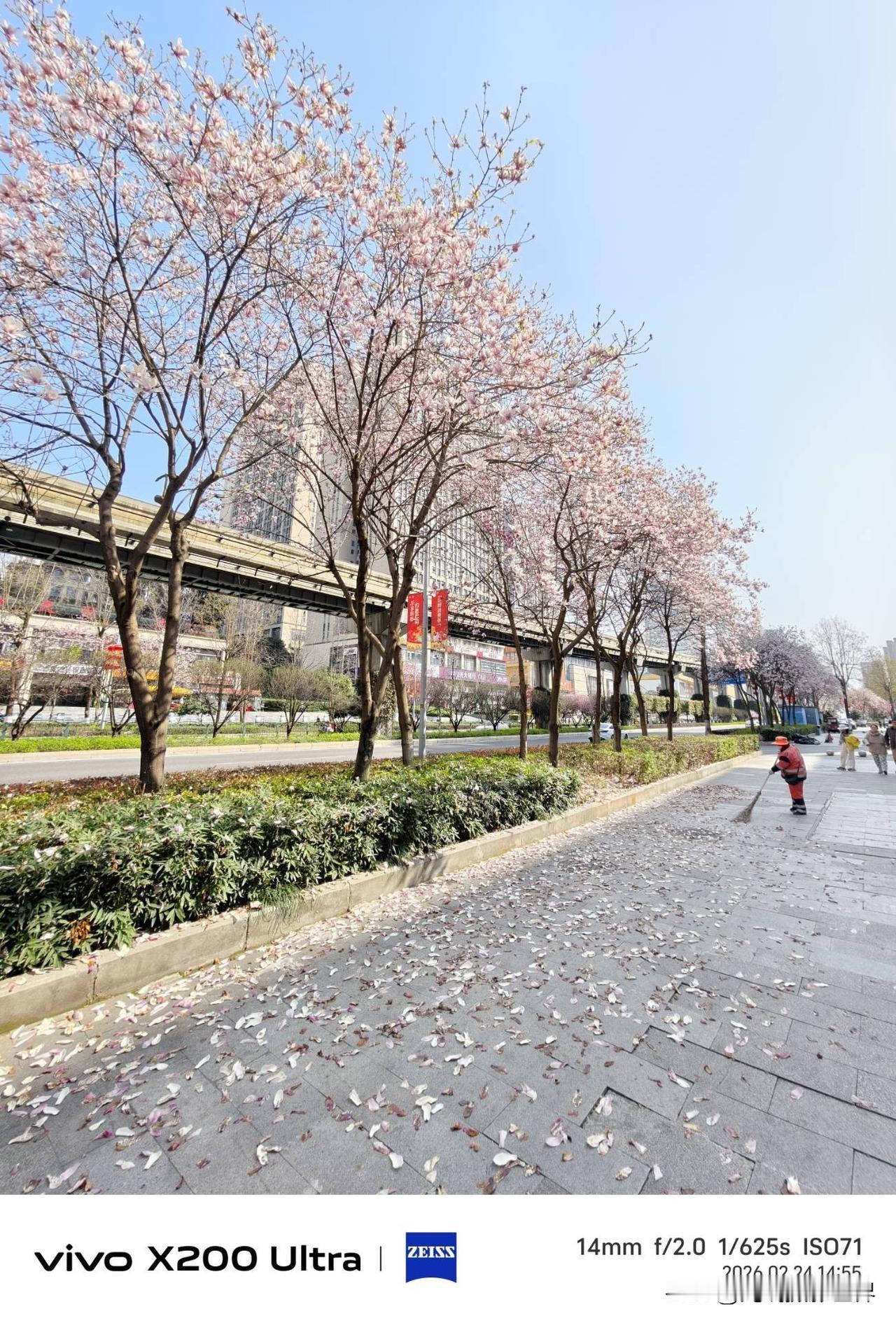 2月24日,大年初八,重庆玉兰花盛开啦!但是,不幸的是,轻轨3号线,学堂湾站到大山村站之间的这些玉兰花,好像已经到尾声了,已经不是最佳状态啦!哎呀!2026年春天,来的太早啦!最温暖的春节假期期间,玉兰花已经是最佳状态啦! 今天,摄影畅销书作家曾兰老师,来到巴南区万达广场这里的渝南大道,欣赏开往春天的地铁列车……心情好极啦! 只是,很可惜,如果再早来3-5天,就好啦! 没有办法,2027年春天,希望能够遇到最佳状态的重庆玉兰花呀!