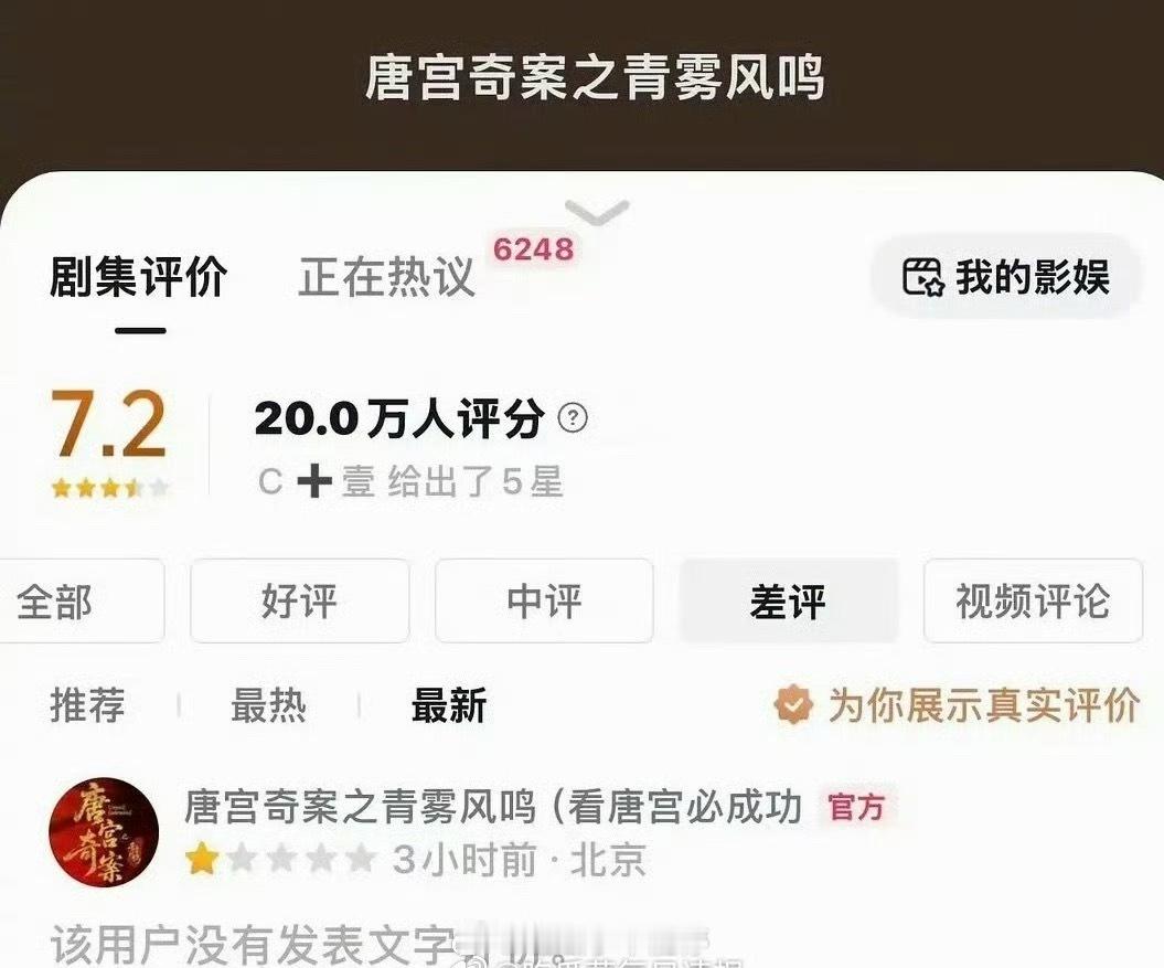 《唐宫奇案》官抖说给剧打一星不是官方所为,目前事件正在持续排查