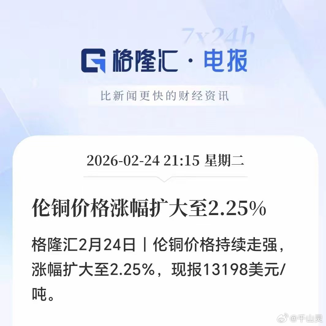 深夜炸盘!大利好突袭2月24日晚,伦敦铜暴力拉升,涨幅直接冲至2.85%,站稳13198美元/吨!这波深夜异动绝非偶然,直接点燃全球有色情绪,今晚盘面就是明天A股的关键信号!很多人不懂伦铜的分量——它不只是工业金属,更是全球资金风险偏好+贵金属行情的风向标。铜价大涨,意味着宏观预期回暖、资金大举回流商品市场,贵金属的上涨空间彻底被打开!今晚伦铜暴力助攻,直接坐实贵金属多头趋势稳固,不是一日游脉冲反弹,而是有基本面+资金面双重支撑的趋势行情!再看A股贵金属板块,资金早已提前埋伏,伦铜这波大涨就是最强催化剂!明天板块高开高走、全线回血概率极大,低位筹码拿稳别被洗出去!你们觉得明天贵金属会怎么走?评论区聊聊!