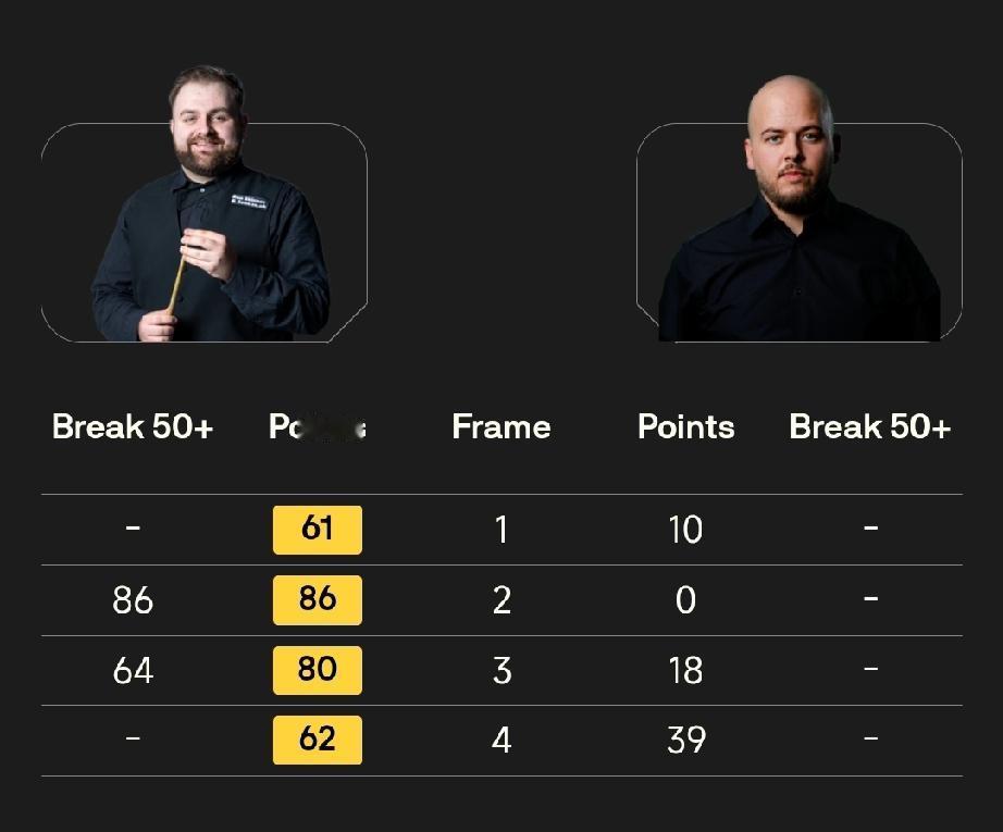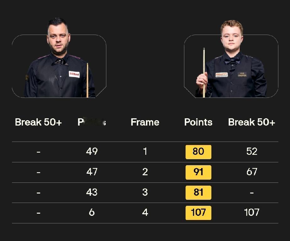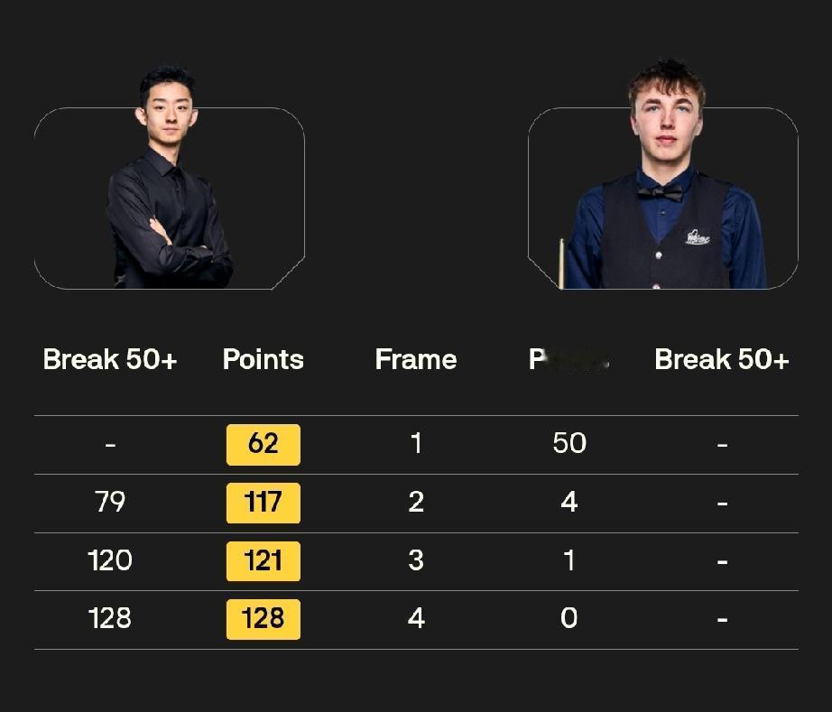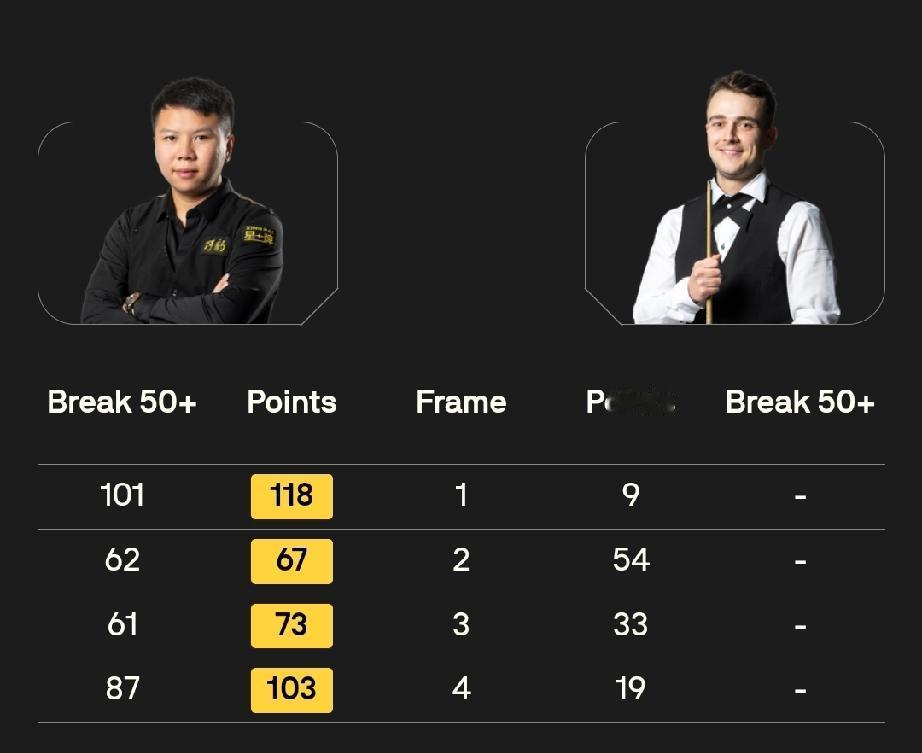 威尔士公开赛首轮产生了7场4-0! 常冰玉,4杆破百击败肖恩·墨菲 加里·威尔逊,3杆破百击败阿米尔·萨霍什 吴宜泽,2杆破百击败本·默滕斯 周跃龙,1杆破百击败亚历山大·乌森巴赫 斯坦·穆迪,1杆破百击败吉米·罗伯逊 乔·奥康纳,1杆破百击败亚伦·希尔 杰克逊·佩奇,击败卢卡·布雷切尔