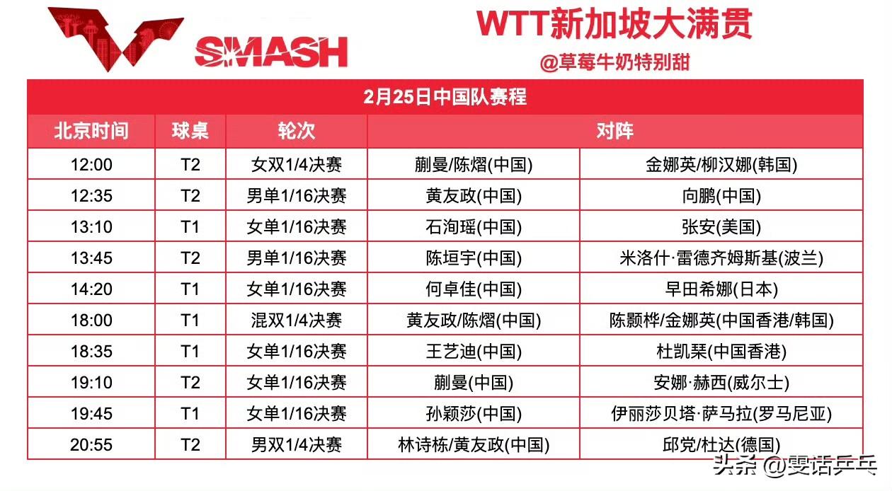2月25日全日赛程P2 2月25日中国队赛程 12:00 T2 蒯曼/陈熠🇨🇳VS金娜英/柳汉娜🇰🇷 12:35 T2 黄友政🇨🇳VS向鹏🇨🇳 13:10 T1 石洵瑶🇨🇳VS张安🇺🇸 13:45 T2 陈垣宇🇨🇳VS米洛什·雷德齐姆斯基🇵🇱 14:20 T1 何卓佳🇨🇳VS早田希娜🇯🇵 18:00 T1 黄友政/陈熠🇨🇳VS陈颢桦🇭🇰/金娜英🇰🇷 18:35 T1 王艺迪🇨🇳VS杜凯琹🇭🇰 19:10 T2 蒯曼🇨🇳VS安娜·赫西🏴 19:45 T1 孙颖莎🇨🇳VS伊丽莎贝塔·萨马拉🇷🇴 20:55 T1 林诗栋/黄友政🇨🇳VS邱党/杜达🇩🇪