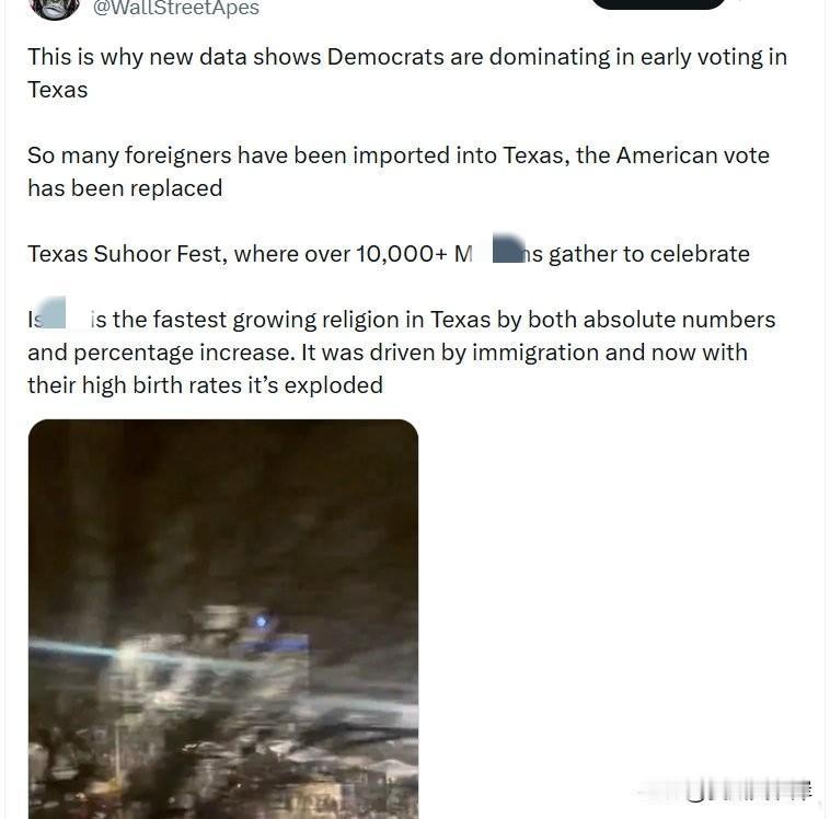 这就是为什么新数据显示民主党在得克萨斯州的提前投票中占据主导地位。 如此多的外国人被“引入”得克萨斯州,美国人的选票已经被取代了。 得克萨斯州封斋节庆祝活动,有超过1万名MSL聚集庆祝。 无论是从绝对人数还是增长百分比来看,YSL教都是得克萨斯州增长最快的宗教。这是由移民推动的,而现在,随着他们的高出生率,这一趋势呈爆发式增长。