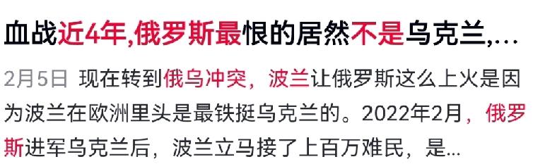 大跌眼镜!俄罗斯民调:最敌视的不是美乌,而是波兰? 俄乌冲突激战近四年,外界普遍认为俄罗斯最恨美国或乌克兰,可最新民调结果却颠覆认知——波兰才是俄罗斯民众心中头号对手。 冲突爆发后,波兰彻底放弃中立,甘当西方反俄急先锋。它不仅接收大量乌克兰难民,更成为欧美援乌核心转运枢纽,武器、弹药、情报经波兰源源不断输送前线,还带头加码对俄制裁、推动北约东翼增兵,极力拱火冲突升级。 俄波本就有数百年历史宿怨,如今波兰紧邻俄罗斯,大肆扩军备战,主动充当北约反俄前沿,步步紧逼,敌意直接且强烈。 在俄罗斯民众眼中,美国远在大洋彼岸仅为幕后操控,乌克兰与俄罗斯同根同源尚有民族牵绊,而波兰近在咫尺、寸步不让,成为最直观的现实威胁。 大国博弈的真相残酷又现实:最可怕的从不是远方的棋手,而是贴身对立、历史与利益全面冲突的邻国。波兰主动冲锋陷阵,最终将自己推到了俄罗斯的对立面顶端。 对此你怎么认知? 俄乌冲突 国际局势