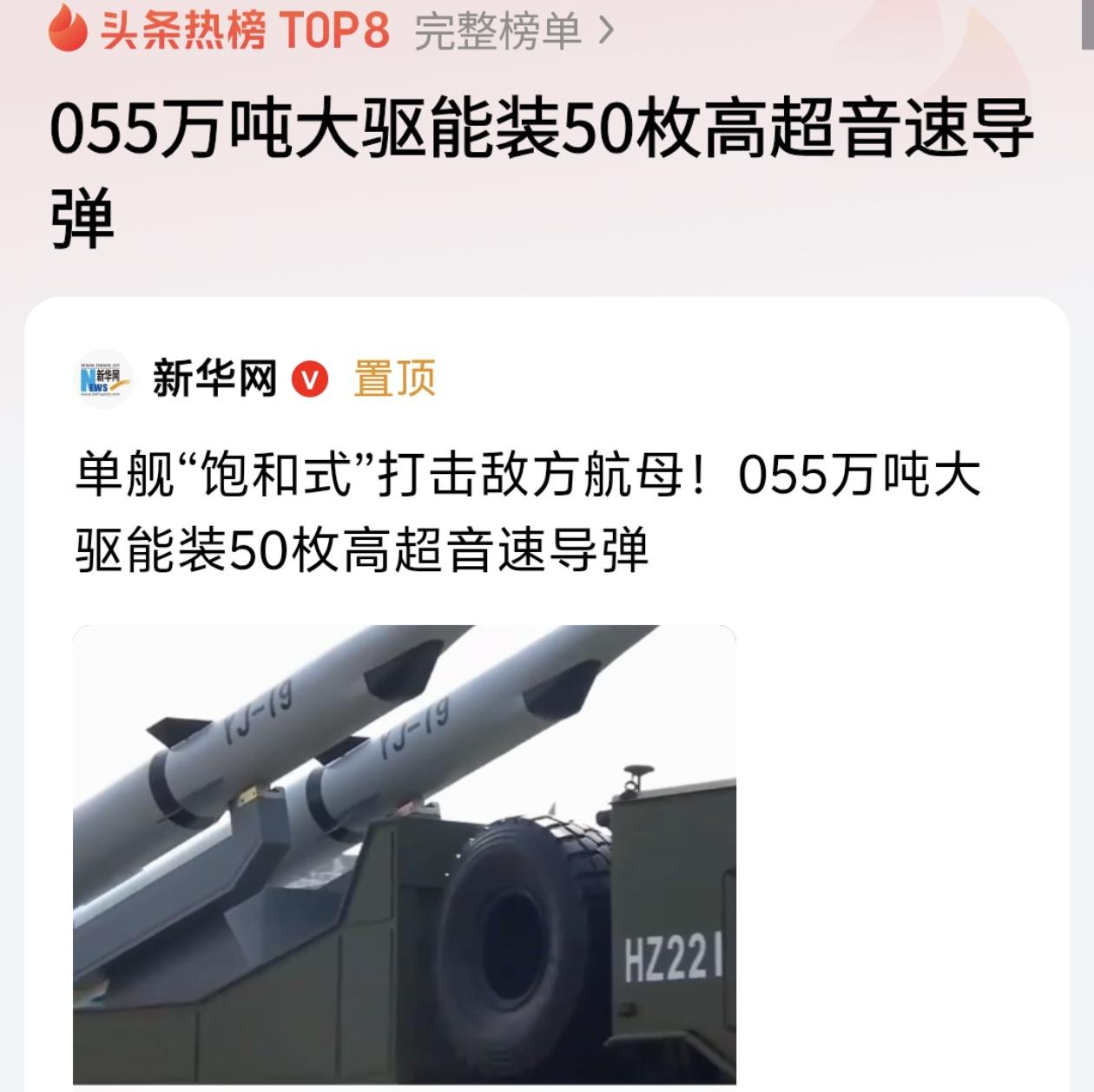 055大驱实力有多强?单舰能装50枚高超弹,航母见了都得绕着走! 最近军迷圈炸锅了!咱们的055型万吨驱逐舰又曝出猛料——单舰居然能搭载50枚高超音速导弹!这是什么概念?相当于把一个移动的"导弹堡垒"开到了海上,难怪外媒都惊呼"航母杀手"来了! 可能有朋友会问:50枚导弹很多吗?要知道普通驱逐舰也就装30-40枚导弹,而且大多是防空导弹。但055大驱这次装的可是"航母克星"——高超音速导弹!这种导弹飞行速度超过5倍音速,还能变轨机动,对方根本拦不住。50枚齐射是什么场面?军事专家管这叫"饱和式打击",就算是十万吨级的核动力航母,挨上几发也得失去战斗力。 更厉害的是055大驱的"一坑四弹"黑科技。简单说就是一个垂直发射单元能塞4枚导弹,既可以装反舰导弹,也能兼容防空、反潜导弹。128个发射单元灵活搭配,既能当"带刀侍卫"保护航母编队,又能单枪匹马执行突击任务,简直是"海上多面手"! 难怪美军最近总盯着咱们的055大驱。去年"拉萨舰"编队绕日本海走了一圈,直接让日本自卫队紧张了好几天。现在有了50枚高超弹的加持,咱们的航母战斗群远洋作战能力又上了一个大台阶。 咱们中国海军这些年的进步真是肉眼可见,从以前的"小艇打大舰"到现在的万吨大驱纵横四海。这背后是无数科研人员的默默付出,也是国家实力的最好证明。为咱们的海军点赞,为强大的祖国自豪!