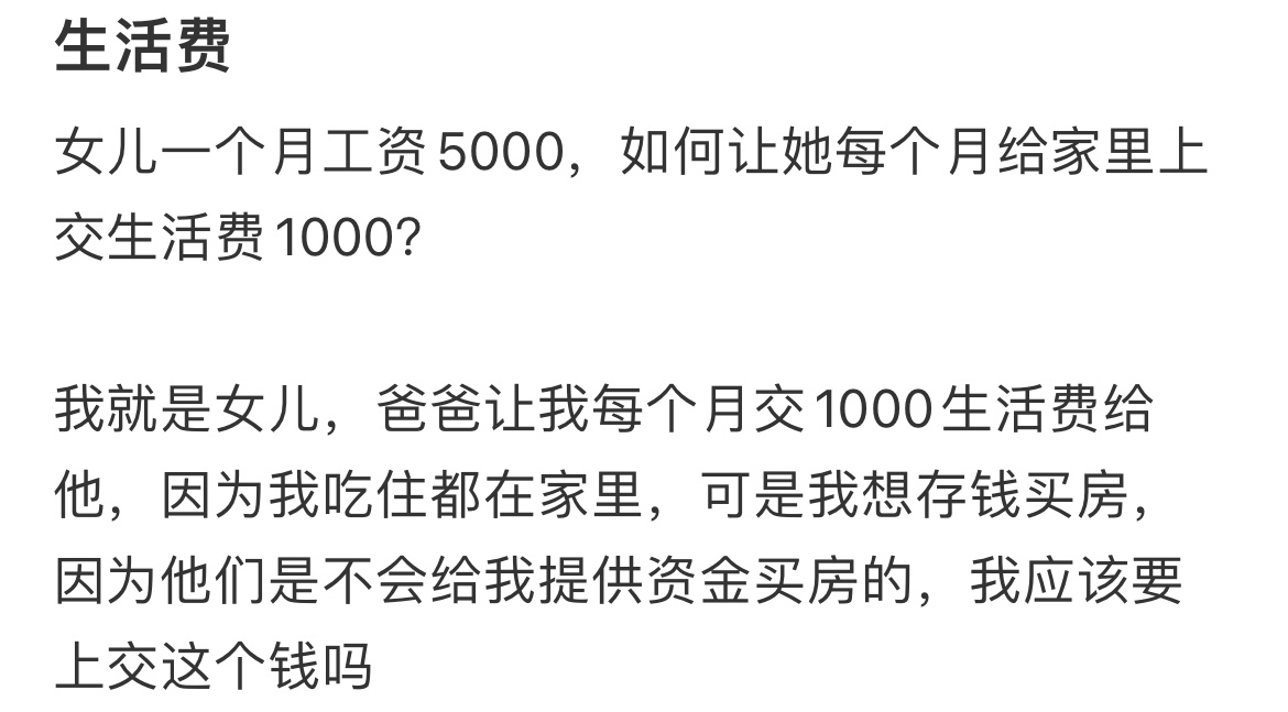 女儿一个月工资5000,如何让她每个月给家里上交生活费1000?