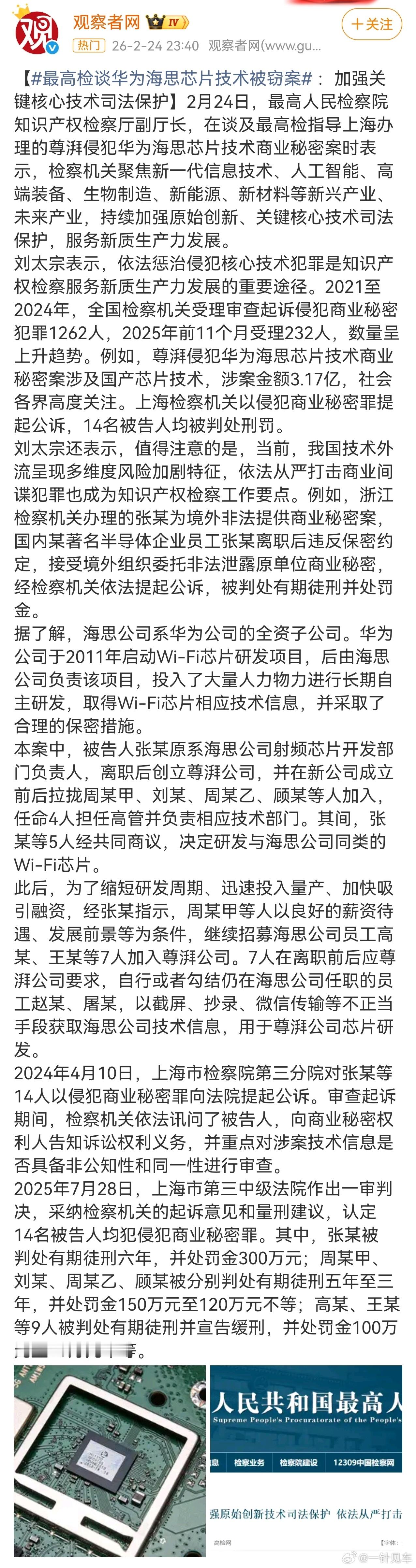 最高检谈华为海思芯片技术被窃案 加强关键核心技术司法保护
