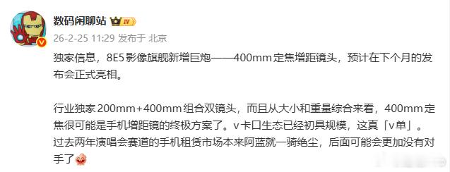 数码闲聊站刚爆料了大消息!vivo X300 Ultra要上400mm定焦增距镜了200mm+400mm双增距镜组合,完全是照搬专业相机镜头群思路,不是堆料是真做影像生态。之前vivo带火200mm增距镜,拍演唱会、拍鸟、远景直接封神。现在又抢先捅破400mm天花板,等于重新定义手机长焦上限。不用猜,后面肯定有友商跟进,手机影像远摄赛道,vivo又一次跑在最前面 深圳