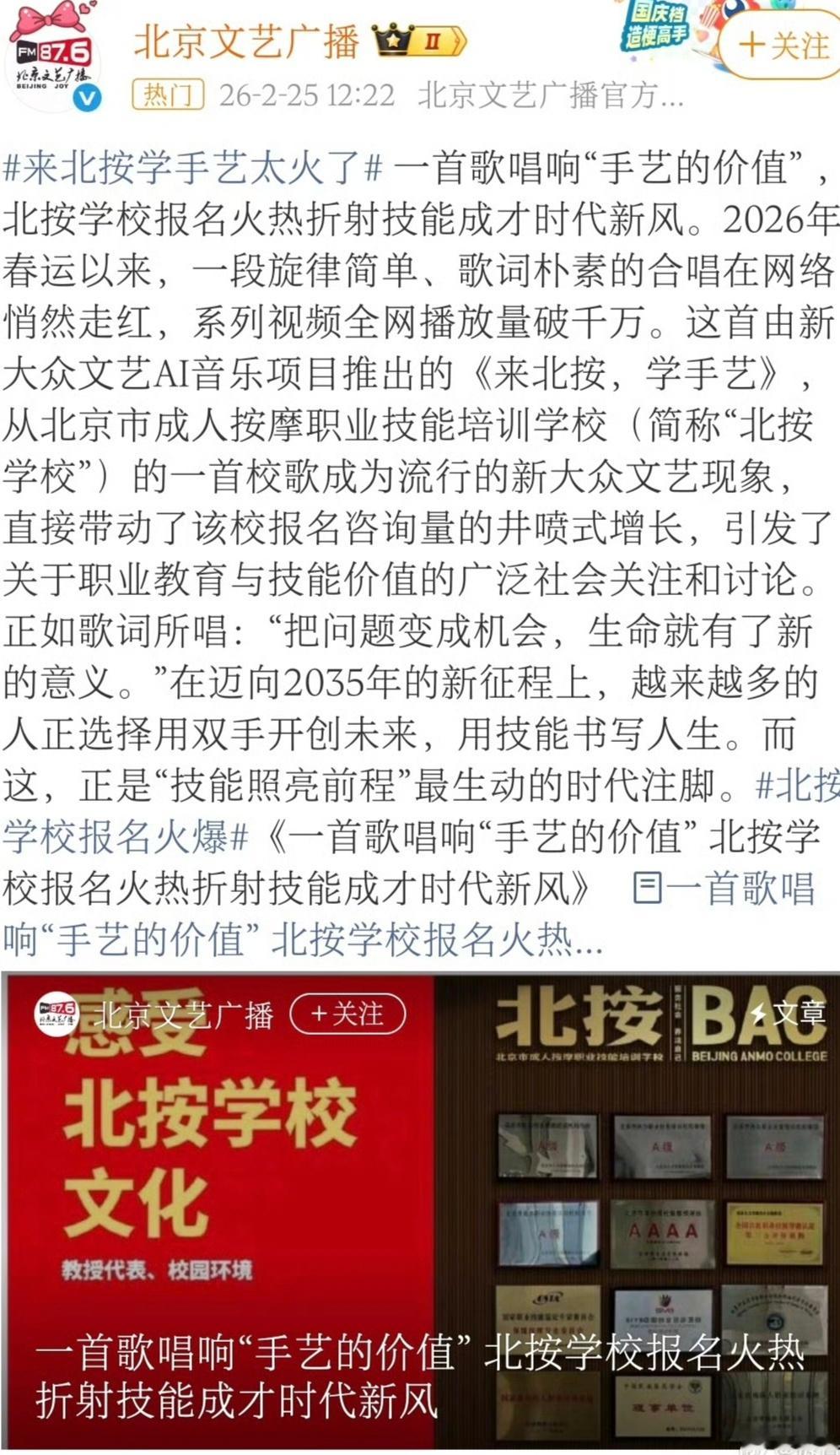 来北按学手艺太火了 “来北按,学手艺”唱红春运,全网千万播放的热度,是平凡人对踏实生活的向往,更是社会对技能价值的重新认可。一句“服务社会,养活自己”道尽劳动者本真追求,也让北按学校报名咨询量井喷,这是大众对“凭手艺立身、靠技能出彩”的集体认同。对如今的人们而言,手艺从不止是谋生手段,更是普通人安身立命的底气,是收获尊严与自信的抓手,北按学校培养数十万技能人才的故事,正是双手创造价值的最好缩影。这首歌的全民共鸣,更源于其传递的多元成才观:职业教育从非退路,而是别样的成才星光大道,社会对每一种奋斗的平等尊重,才是最动人的时代新风。坚信一点,技能照亮前程,手艺成就人生,愿每个努力生活的人,都能以一技之长,书写属于自己的人生精彩。 北按学校报名火爆
