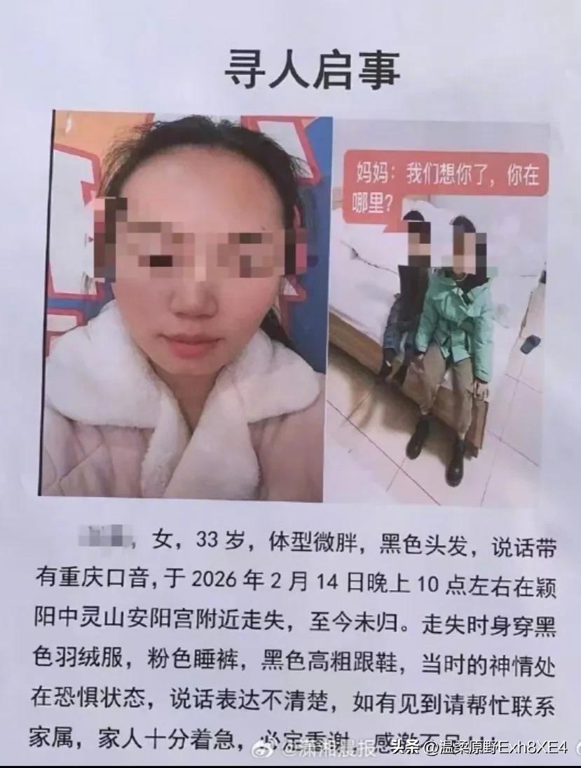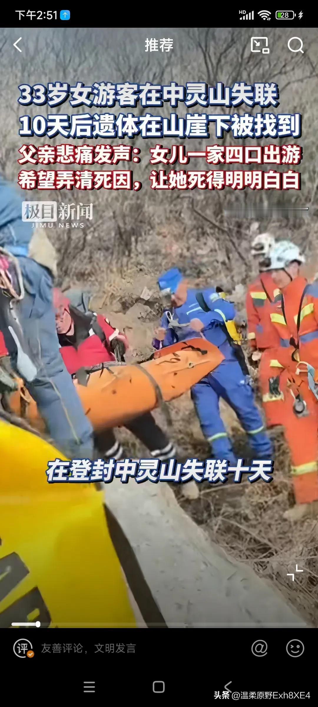“太古怪了!”河南登封,一对夫妻带着两个孩子(分别是10岁、8岁),去中灵山上祈福,结果晚上10点左右,妻子走失,丈夫带着个行李箱和两个孩子下山了?网友:这事透着古怪,家属也古怪,还真不好说,等结果吧。 事情发生在2月14日,据丈夫发布的找人讯息称,夫妻俩带着孩子是从重庆来中灵山祈福的。当晚妻子就在安阳官附近走失了,身穿黑色羽绒服、粉色睡裤、黑色高跟鞋。 丈夫称妻子当时神情恐惧,说话表达不清,但没说缘由,也没描述当时发生了啥事及为啥没看住她。 后来一位参与了寻人的当地民宿店主回忆称,2月14晚,在大风口(大风口往山顶只能徒步,一般车子都停在这里)下山的路上遇到了失联者丈夫“三个人,一个男的带着行李箱,带着两个孩子。问他们坐不坐车,他们说不坐”。 该民宿老板还表示,中灵山上比较原生态,没经过太多开发,晚上很冷。如果游客走走停停上山,大概需要3-4个小时,走路快的话也要近2个小时了。 找了10天后,很可惜,该女子已经去世,在最山顶的安阳宫南面一处悬崖下找到的遗体,法医初步鉴定为高坠死亡。 目前,刑警已介入,将重点调查是否涉及刑事案件;女子父亲也强调,希望女儿需“死得明白”。 由于该女子才33岁,死亡又有些离奇,引起众多网友热议: “一家人一起来的,目的是祈福,然后一个人走失” “天气那么冷,晚上十点去山上,还有高跟鞋...睡裤...总觉得哪里怪怪的......” “查查买大额保险没?还有查下男方有没有小三,别忘了琳生冰,小三需要上位。” 小编认为,虽然事情有些离奇,但孩子一个10岁,一个8岁,已经是能说得清的年纪了;而且这两年的技术发展得贼快,山上虽然没有监控,可痕迹比对及解剖就能还原大部分实情。 法网恢恢,漏不了“凶手”的!静待结果!天南地北大拜年 (信源:极目新闻)