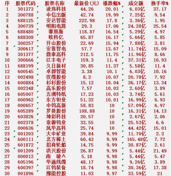 2月25日,均线多头排列的30名单汇总 凌玮科技:最新价 44.26元,涨幅 +20.01%(涨停) 中信出版:最新价 42.74元,涨幅 +19.99%(涨停) 安达智能:最新价 222.98元,涨幅 +17.80% 明阳电路:最新价 29.30元,涨幅 +17.06% 赛恩斯:最新价 118.87元,涨幅 +16.54% 欧科亿:最新价 65.87元,涨幅 +16.17% 开山股份:最新价 22.69元,涨幅 +15.94% 安靠智电:最新价 57.70元,涨幅 +13.67% 鼎泰高科:最新价 212.50元,涨幅 +11.75% 江丰电子:最新价 159.30元,涨幅 +11.40%