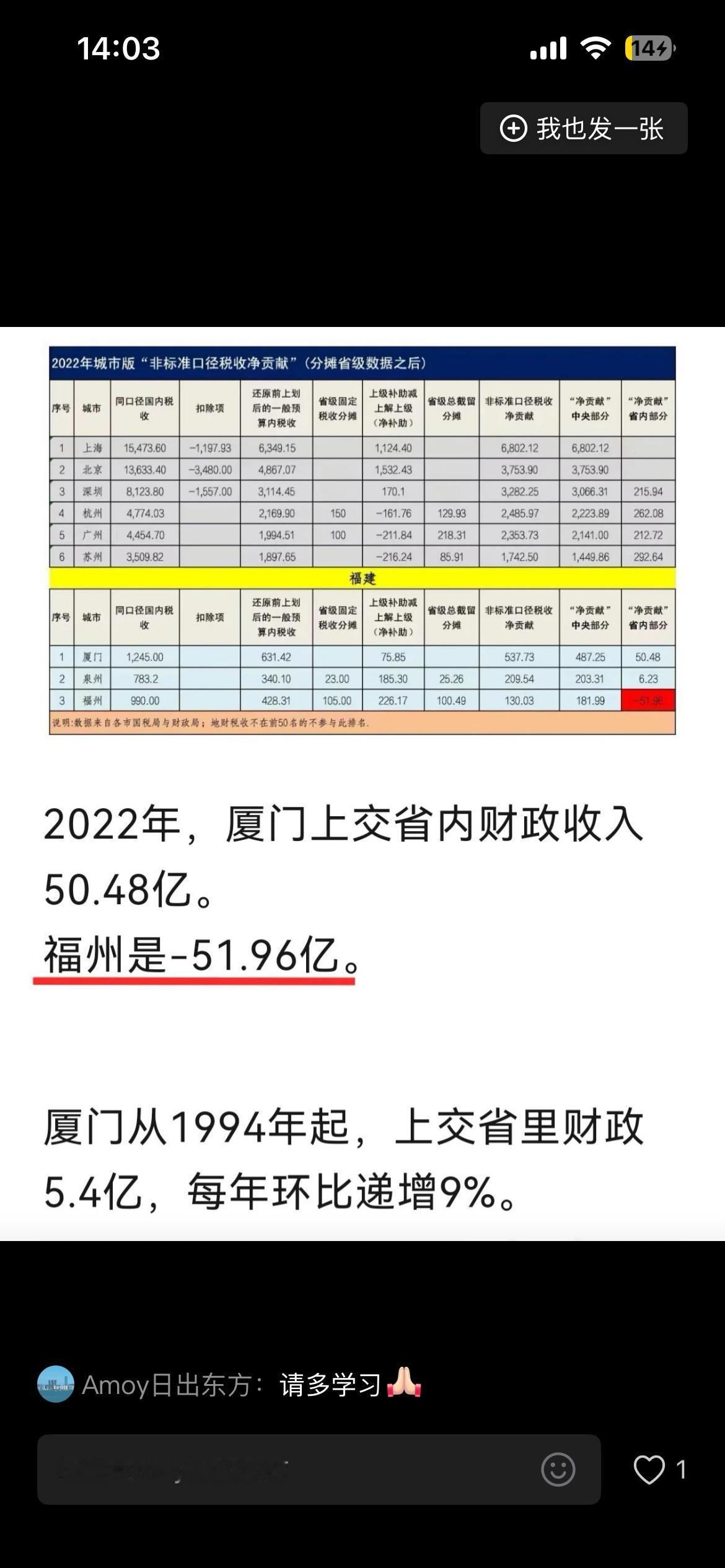 福建的财收,主要是厦门,泉州贡献的? 厦门,泉州网友,发了一个自己制作的表格,内容是:2022年,厦门,泉州 净贡献福建财收,各为50.48亿,6.23亿;福州,从省财收净收益51.96亿。 看到这组数据,按常识,大家都会知道,这是不真实的。 1、官方数据,2022年,福建地方一般公共预算收入3339亿,作为福建两个主要城市,厦门,泉州的净贡献之和 只有56.71亿,只占1.69%? 2、按照此表格:厦十泉一福=4.75亿,也就是说,厦门,泉州贡献省里的财收,扣除转移支付给福州的,只余4.75亿,那么,赤字的南平三明龙岩莆田,每个市,平均最多只能得到省级转移支付,约1亿?够干什么?