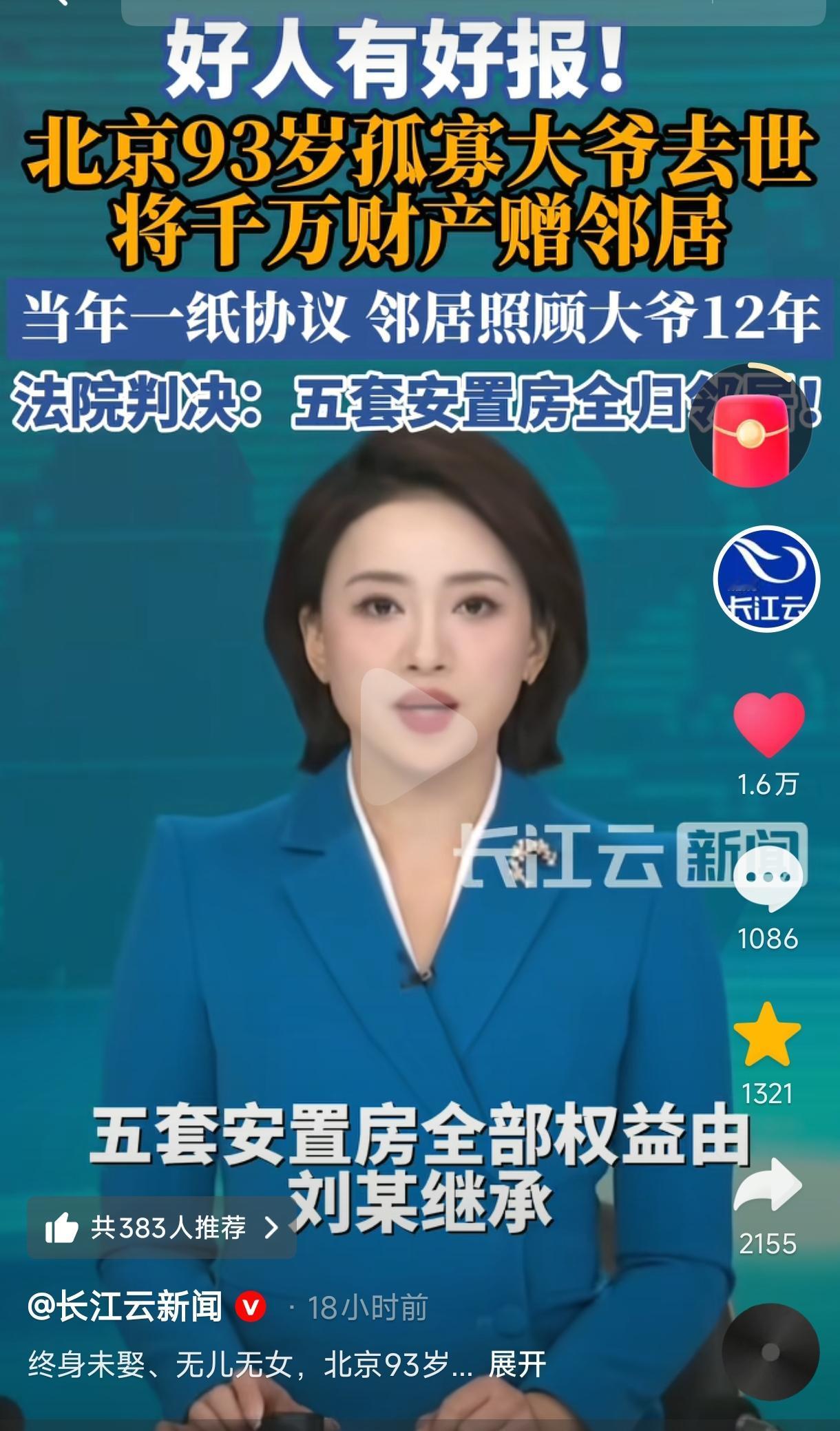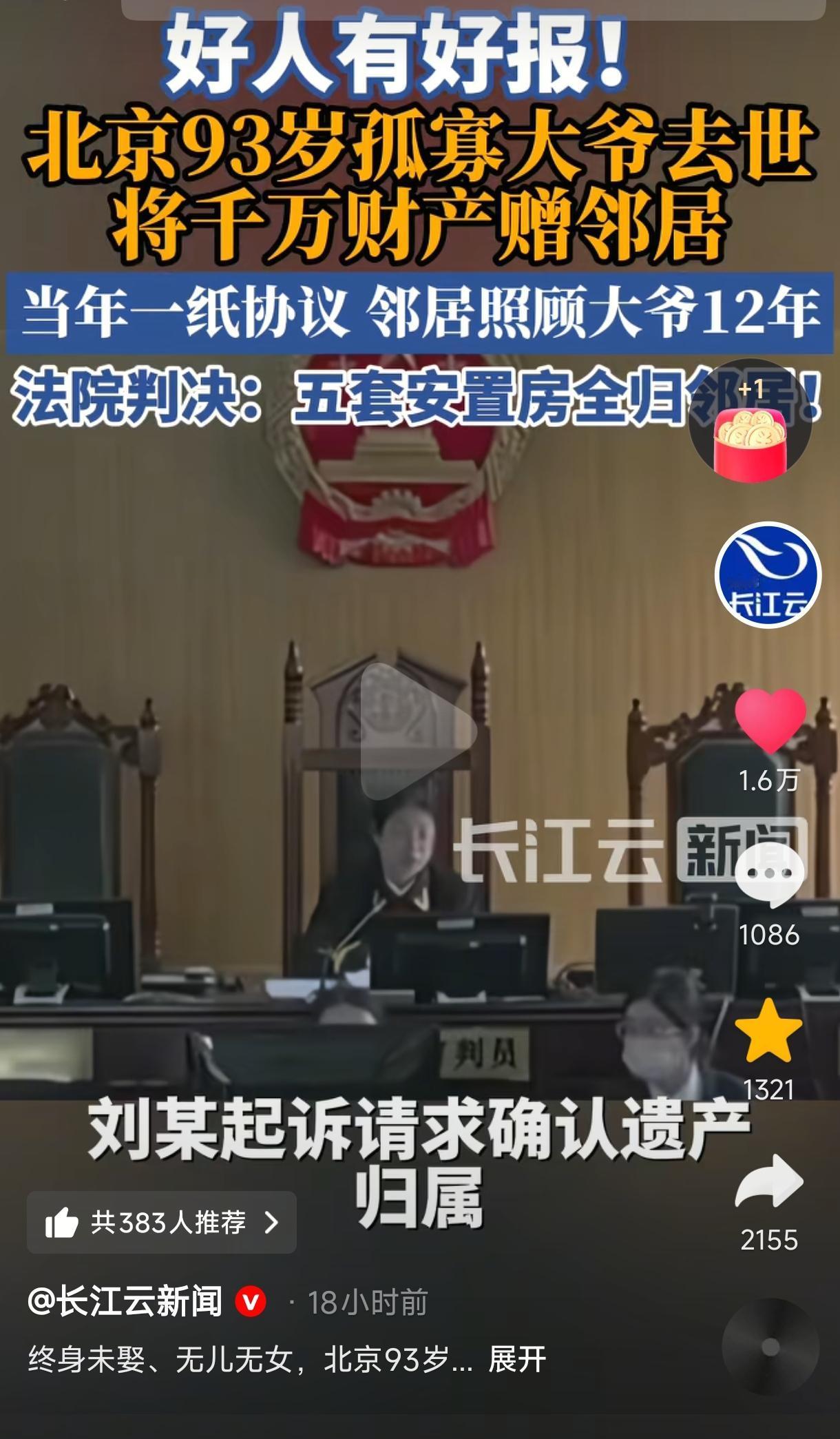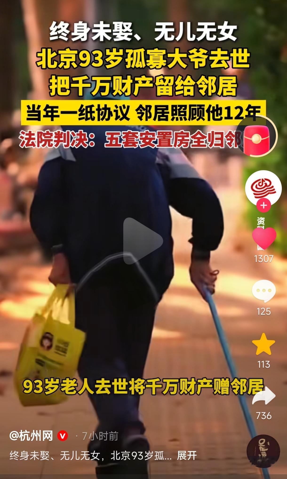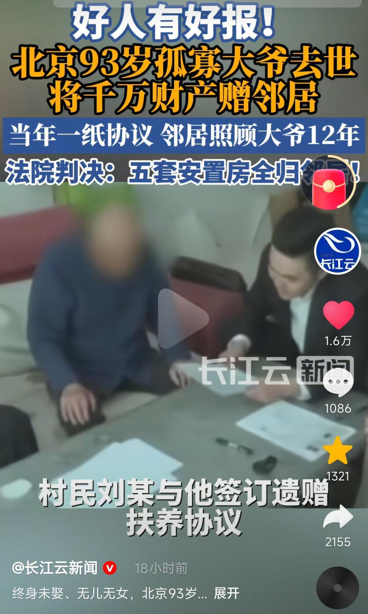 “好人好报!” 北京一93岁大爷无妻无子,孤身一人,邻居不离不弃悉心照料长达12年,大爷临终前将5套安置房及380万补偿款近千万遗产全部赠予邻居。大爷去世后,邻居又妥善料理后事,为避免遗产纠纷,邻居向法院申请确认遗产归属,最终法院经调查,判决协议有效,五套安置房及补款偿全部归邻居所有。网友:这位邻居是真心对大爷好,不然大爷也不会把全部遗产赠予他。 (来源:长江云新闻、都市现场等) 北京一位阮姓大爷一生未娶,膝下无子无女,一直孤身一人生活,虽然他有4个哥哥和1个妹妹,但大家关系都比较疏远与冷漠也极少来往,因此阮大爷的养老便成了一大难题。 好在邻居刘某是一位热心肠的人,一直对阮大爷照顾有加,平日里总帮大爷做这做那,大爷有个头疼脑热又嘘寒问暖、忙前忙后的,让阮大爷不再孤单并感受到了家庭的温暖。 这一切都被村委会看在了眼里,为了能让阮大爷安享晚年,也为了让邻居的善意有回响。2011年,由村委会牵头,81岁的阮大爷与心地善良、相处和睦的邻居刘某签订了《遗赠扶养协议》,阮大爷晚年生活由刘某照料,身后遗产全部归刘某所有。 但当时阮大爷只有11间房屋及为数不多的一些存款,但早把阮大爷当亲人对待的刘某并不在意这些。 之后刘某便一直悉心照顾阮大爷,多年如一日,毫无怨言,把阮大爷当自己父亲一样照顾得无微不至,两家关系本来就亲厚,如今更是相处得其乐融融,羡煞旁人了。 都说,好人有好报,几年后村里便迎来了一个振奋人心的大好消息,也令这一场“你为我养老,我赠你遗产”的双向奔赴迎来了圆满的结局。 2017年,阮大爷所在的村庄拆迁,阮大爷原有的11间老旧房屋被拆除后获得了5套安置房及380多万元的补偿款,总额达上千万,这可是一笔丰厚的巨额财产啊。 由于阮大爷与邻居刘某已经签订过《遗赠扶养协议》,这就意味着阮大爷身故之后这些上千万的遗产还是要赠予给为他养老送终的邻居刘某的。 为了避免发生遗产纠纷,2023年3月,93岁高龄的阮大爷自知大限将至,就趁自己脑子清醒,在律师的见证下,二人再次立下约定,由刘某继续悉心照料阮大爷晚年生活,阮大爷则承诺将自己名下5套安置房及所有财产尽数留给刘某。 之后刘某也没有因为千万遗产近在咫尺、唾手可得而对阮大爷疏于照顾,而是仍旧尽心尽力地照顾着他。 2023年9月,93岁的阮大爷安详地闭上了双眼,刘某妥善为他料理了后事。阮大爷这一生虽然没有婚配,无儿无女,却拥有了一个舒心的晚年,也算不枉此生了。 按照遗赠扶养协议规定,阮大爷身后的千万身家就该归邻居所有了,但因为阮大爷还有其他亲属未并参与协议,为避免以后发生遗产纠纷,他向法院起诉了遗产确认。 之后法院经仔细调查,最终确定协议有效,判决阮大爷的五套房产及其他财产全部归邻居所有。 不得不说,阮大爷一直都是明智且清醒的,虽然他有哥哥妹妹等亲属及其子女但他们并未参与对阮大爷的照顾,也就没有遗产继承了。 这个真实故事将“好人有好报”诠释得淋漓尽致。邻居对老人善待有加,比血缘至亲更胜,“你养我老,我顾你后”,这便是孤寡老人与善良邻居的双向奔赴吧。 有人真心实意陪在身边,走后财产留给善待自己的人,对老人来说“老有所依,心有所安”,对邻居来说“真心被看见,善意有回响”,这便是最理想的晚年结局之一吧。 常言,爱出者爱返,福往者福来;你只管善良,上天自有安排。世间所有的福报,无不是善良的积累,祈愿每一个心善之人都能被世界温柔以待。