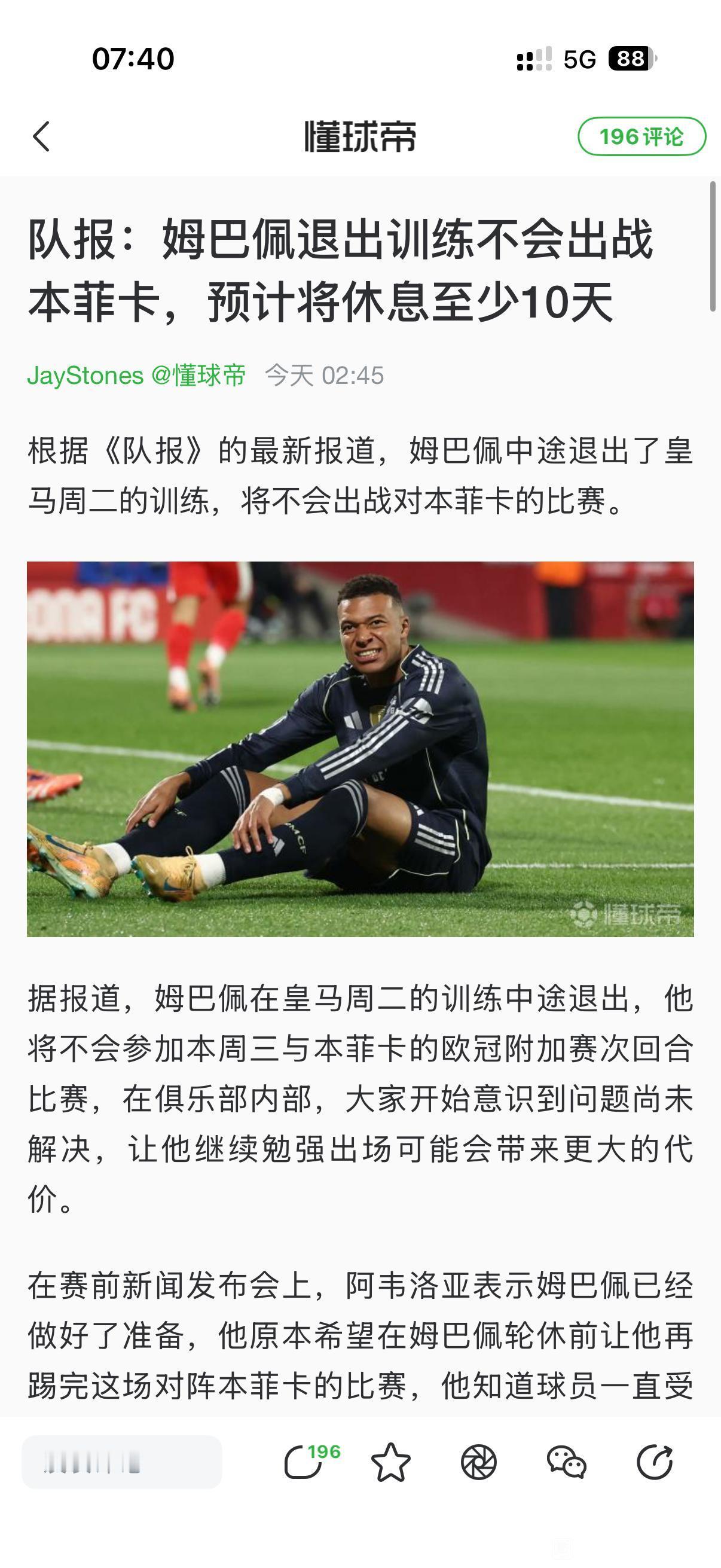 今晚欧冠姆巴佩缺席,皇马不会被淘汰吧! 今天国际米兰率先回家了,皇马最差成绩是欧冠16强,今年有一点悬呀。 姆巴佩上场太多,有伤也正常,但是皇马不能缺少他!![可怜]