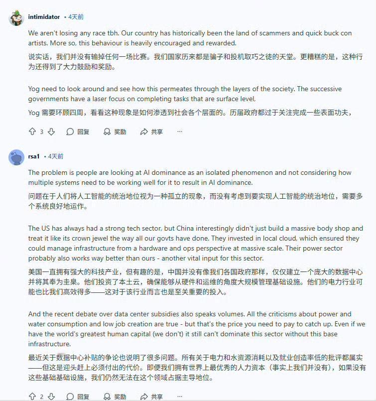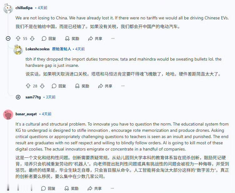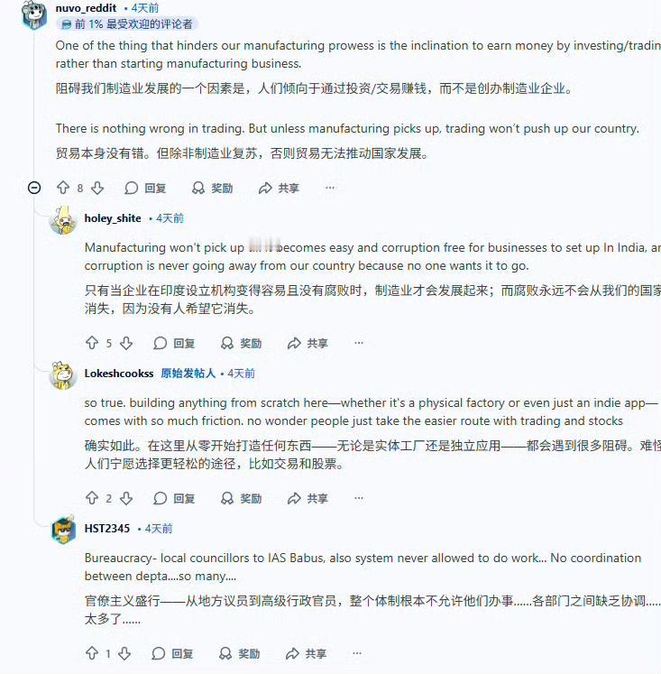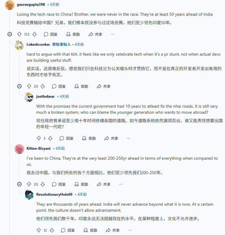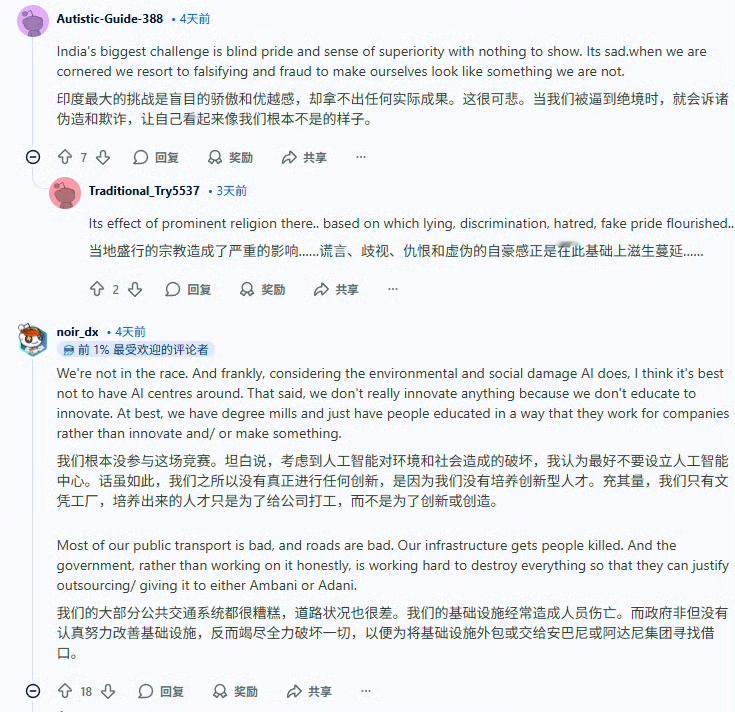 印度人终于开始大规模反思了,会不会带来迅猛发展? 印度的优势是年轻人口断档第一,国际环境极其友好,国外印度裔多,而且很团结,不会被歧视,职业发展通畅。 但这似乎又是个劣势:既然去国外很容易,去了后生活很舒适,地位也很高,那印度精英何必为印度辛苦劳累呢? 换句话说,华人在国外被歧视,很容易遇到职业生涯天花板,反而是有能力有心气儿的华人为国奋斗的助推动力。 印度裔精英缺少这股推动力。