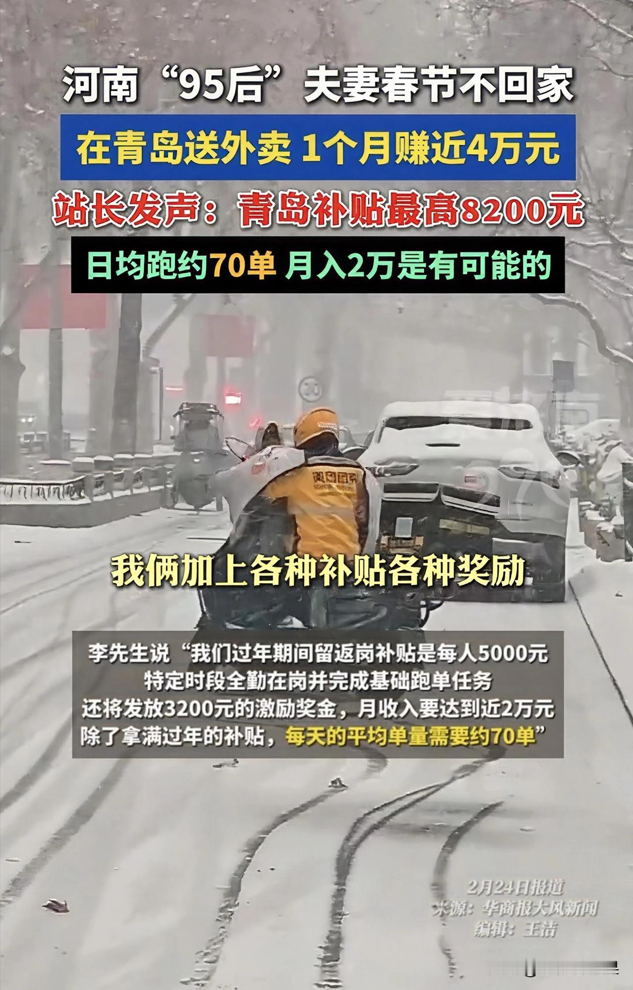 这两天,“95后夫妻春节留守青岛送外卖月赚4万”的新闻刷屏,评论区却吵翻了天。有人质疑“不可能”,有人酸“我也没休息怎么赚不到”,还有人说“春节哪来这么多单”。 但当站点负责人把账算清后,我们才看清这4万背后的血汗。 这对夫妻创业失败,背上20万债务,为了还债,把孩子送回老家,春节期间化身外卖骑手。平台5000元留岗补贴+3200元全勤激励,再加上旅游城市春节翻倍的订单单价,他们日均跑单近70单,每天工作超12小时,硬生生用体力和时间,拼出了近4万的月收入。 可这4万是流水账,扣除车辆、餐饮等成本后,人均净收入其实只有1万左右。他们不是在“炫富”,而是在绝境里咬牙求生。 别再用“幸存者偏差”去质疑别人的努力了。成年人的世界,哪有什么轻松的高薪,不过是有人替你扛下了生活的苦。 愿这对夫妻早日上岸,也愿所有努力生活的人,都能被温柔以待。