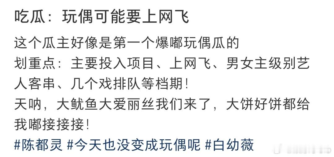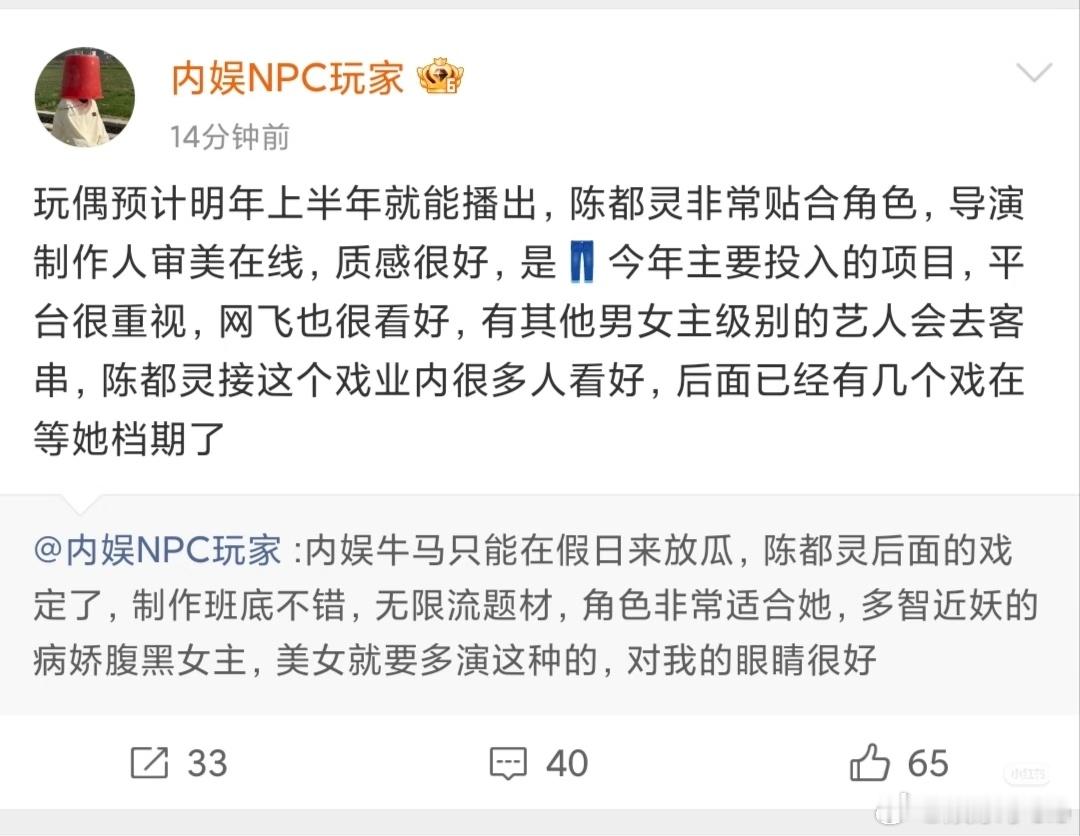 网传陈都灵《今天也没变成玩偶呢》可能会上线网飞并且预计明年上半年就会播出,国内首