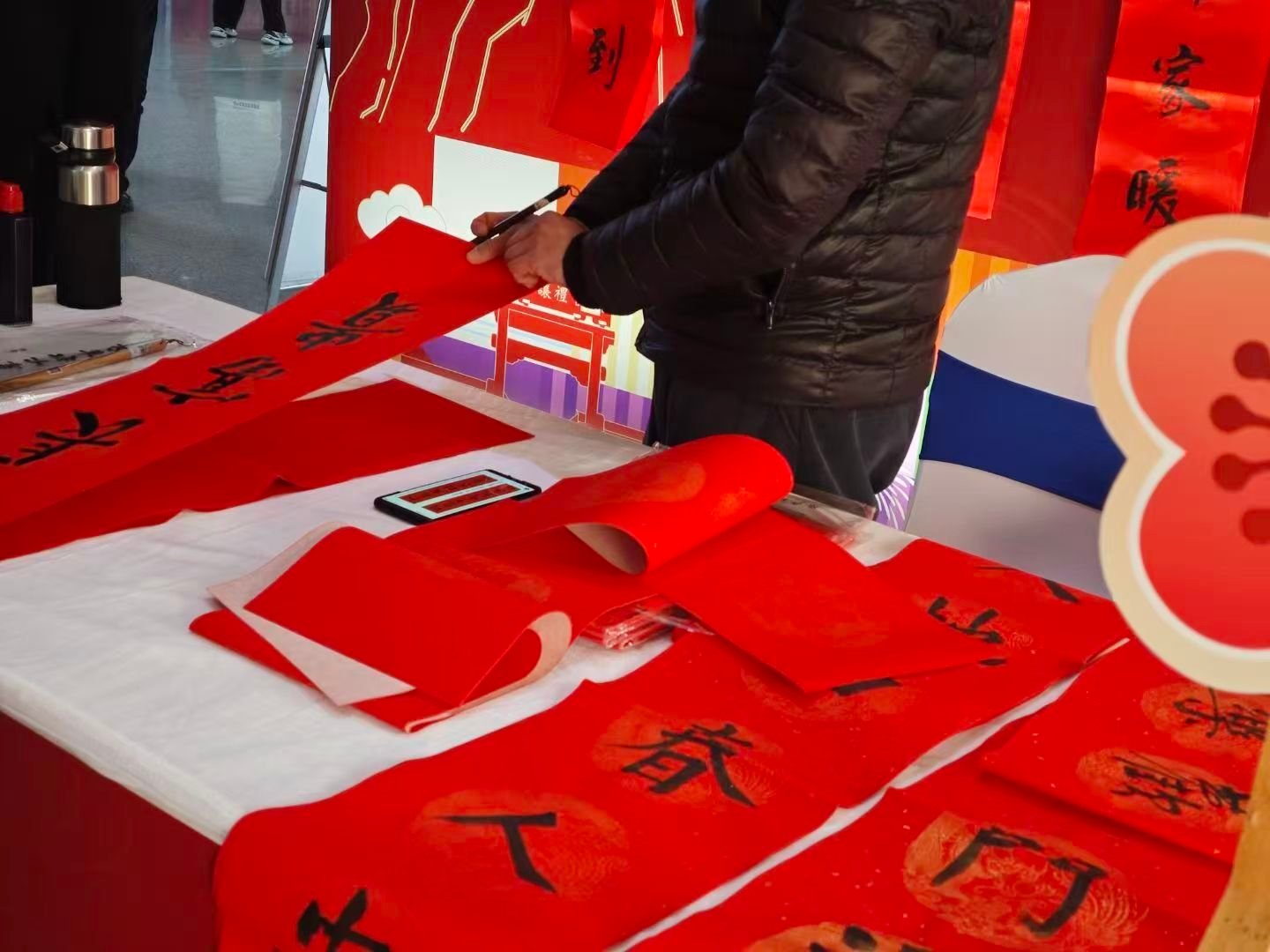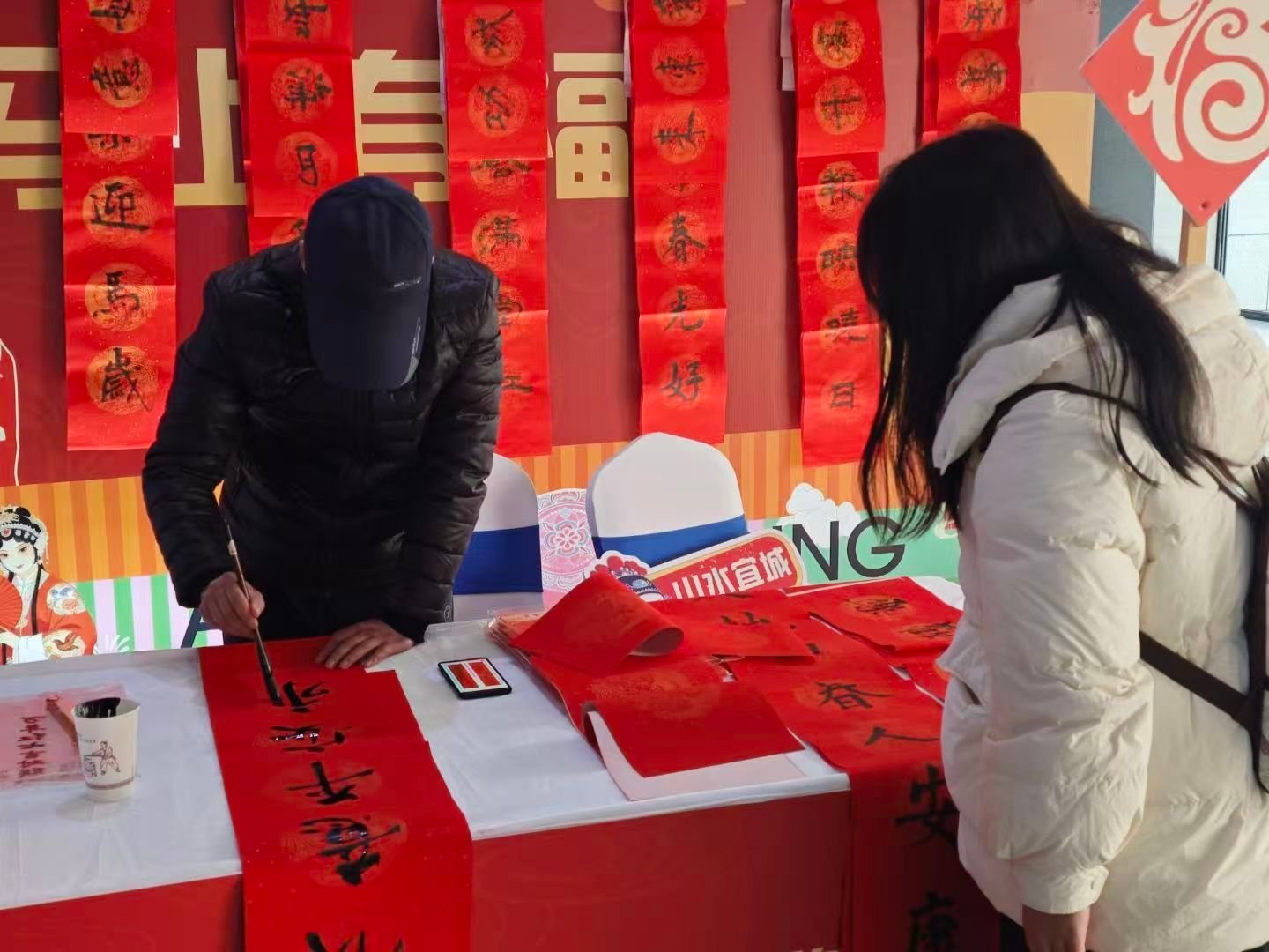 现场红纸铺展、墨香四溢。居民们或驻足观赏,或排队领取,队员在老师的指导下学写“福”字,其乐融融。春联内容既传承经典吉语,也融入“黄河安澜”“运河古城”等地方特色,让传统文化与地域情怀相映生辉。