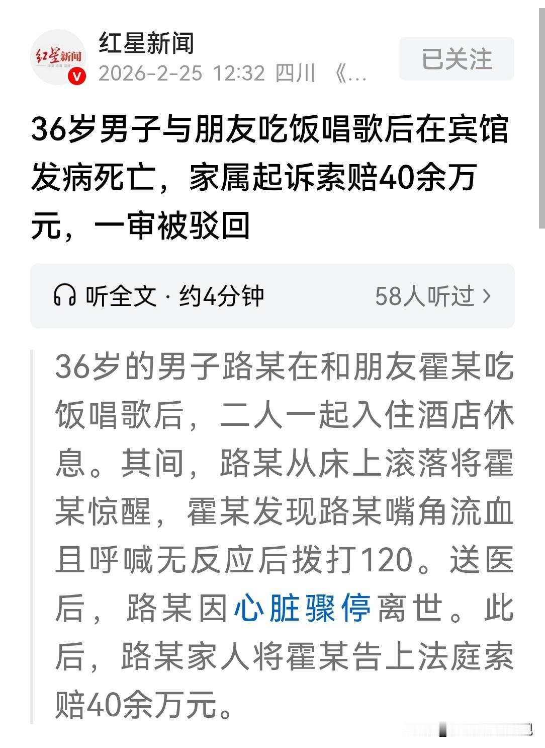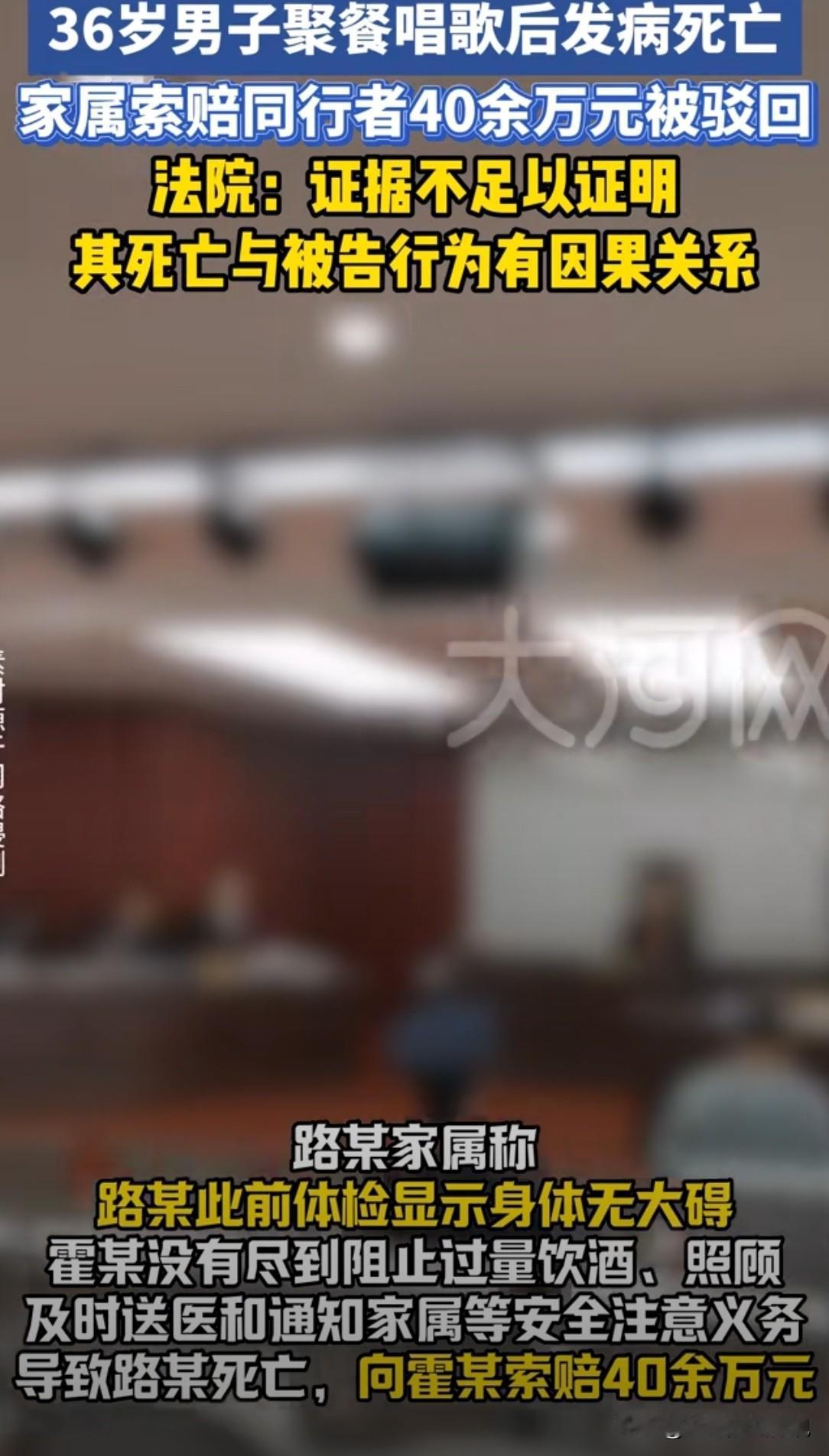 讹人失败!湖南长沙,36岁男子邀请朋友吃饭喝酒,酒足饭饱两人到KTV唱歌。凌晨3点,2人在附近酒店开了一间房休息,期间,男子突然从床上滚落不省人事,朋友立即拨打120,送医后,男子因心脏骤停离世。家属无法释怀,将男子朋友告上法庭,索赔40余万元,一审判决,令家属十分意外! 家属怎么都想不到,一次普通的朋友聚会,竟令年仅36岁的路某失去了生命。 2024年11月的某天晚上,路某联系朋友霍某,邀请他一起去吃夜宵。 霍某欣然前去,两人相约在一家夜宵摊碰面。 两人坐下后,点了几个小菜,还叫了不少酒。 他们边吃边喝酒,畅快地聊生活中的趣事。 酒过三巡,两人的脸上都泛起了红晕,话也越来越多,气氛热烈。 吃完夜宵后,路某觉得还不过瘾,便提议再去KTV唱歌。 霍某也觉得时间还早,两人来到了附近的一家KTV。 在KTV里,他们继续喝酒、唱歌,尽情地释放着内心的激情。 期间,路某感觉身体有些不舒服,便来到KTV大厅休息。 他在大厅的沙发上坐了一个多小时,希望能缓解一下身体的不适。 而霍某则一直在KTV包间里唱歌,并没有察觉到路某的异常。 凌晨3时左右,两人觉得有些疲惫,便决定去附近的宾馆休息。 他们开了一间双人房,因为太晚,各自上床睡觉了。 霍某很快就进入了梦乡,然而,没过多久,他被响动惊醒。 他迷迷糊糊地睁开眼睛,发现路某从床上滚落了到地上。 霍某一开始以为路某只是不小心摔了一跤,便想叫他起来继续睡觉。 可当他走近路某时,却被眼前的景象惊呆了。 只见路某嘴角流血,脸色苍白,无论他怎么呼喊,路某都没有任何反应。 霍某顿时慌了神,他赶紧掏出手机,拨打了120急救电话。 在等待救护车的过程中,他又拨打了110报警电话,希望警方能够提供帮助。 不一会儿,救护车赶到了现场,霍某和医护人员一起将路某抬上了救护车,送往附近的医院进行抢救。 在去医院的路上,霍某心急如焚,他不断地祈祷着路某能够平安无事。 到了医院后,医生们立刻对路某进行了紧急抢救。 然而,尽管医生们竭尽全力,路某还是因为呼吸心跳骤停,经抢救无效不幸离世。 这个消息如同晴天霹雳,让霍某瞬间陷入了巨大的悲痛之中。 他怎么也无法接受,刚刚还和自己一起吃饭唱歌的朋友,就这样突然离开了人世。 而路某的家人,在得知这个噩耗后,更是悲痛欲绝,家里的天都塌了! 才36岁,身体健康的大男人,怎么会突然离世? 他这一走,留下家里老的老小的小,这日子可咋过下去? 家属无法释怀,他们认为,路某之前曾体检,显示身体无大碍。 突然离世,很可能是因为和霍某一起大量饮酒导致的。 而霍某没有尽到提醒、阻止过量饮酒、照顾、及时送医、和通知家属等安全注意义务。 最终导致路某死亡,应该承担一定的责任。 于是,路某的家人将霍某告上了法庭,索赔40余万元。 面对路某家人的指控,霍某感到十分委屈和无奈。 他觉得,这次活动是路某邀请他参加的,属于正常社交范畴。 在整个过程中,他并没有强迫路某饮酒、劝酒或者灌酒的行为。 而且,路某作为成年人,应该对自己的身体状况有合理的判断,不能把责任都推到他身上。 而且,路某的死亡主因系心脏病发作,与饮酒、熬夜、高脂饮食等关联,需要医学鉴定来确认。 如果没有证据证明,这些行为,直接导致了路某急性心梗发作死亡。 那么他的行为,与路某的死亡结果,就不存在因果关系,也就不构成侵权责任。 本案的争议焦点在于,被告霍某对于路某死亡一事,是否存在过错。 首先,从饮酒娱乐活动的发起及过程而言。 双方提交的微信聊天记录,以及霍某的陈述,路某是本次娱乐活动的组织发起人。 而且,路某家属无证据证明,霍某存在强迫路某饮酒、劝酒、灌酒的行为。 这说明,在整个活动过程中,霍某并没有主动促使路某过量饮酒。 而路某作为成年人,应当对自己的身体状况作出合理的判断。 应该清楚自己的酒量,以及饮酒后可能带来的风险。 霍某作为共同饮酒的人,已经尽到了多次询问是否需要就医、陪同一起入住,等谨慎注意义务。 在路某感觉不舒服去KTV大厅休息时,霍某虽然不知道具体情况,但也不能因此就认定他没有尽到注意义务。 毕竟,他不可能时刻盯着路某的一举一动。 那么,法院会怎么判呢? 《民法典》第1165条:行为人因过错侵害他人民事权益造成损害的,应当承担侵权责任。 也就是说,如果一个人的行为存在过错,并且因为这个过错,导致了他人的民事权益受到损害,这个人需要承担相应的侵权责任。 路某家属认为,霍某没有尽到提醒、阻止过量饮酒、照顾等义务,侵害了路某的生命权,所以要求霍某承担赔偿责任。 霍某认为,在路某身体不适后,他陪同入住酒店,发现异常后及时拨打120等,尽到了一定的注意义务,不应承担侵权责任。 最终,一审法院,驳回了路某家属的诉讼请求。