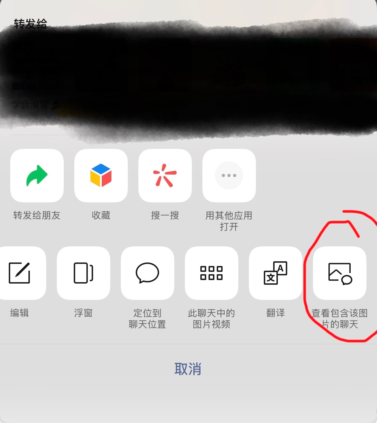 微信今天新增了一个查找图片流向的功能,在聊天界面打开一张图片,长按唤出菜单栏,最下面一行划到最后,点击「查看包含该图片的聊天」,选择聊天还能直接定位到图片在该聊天中的位置。