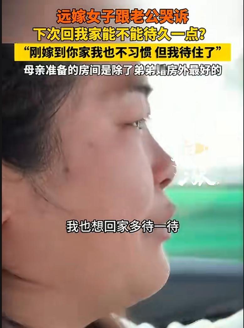 回家的路很长,离开的路更長。 近日,江苏一位远嫁女子的哭诉,让无数远嫁的女儿红了眼眶。视频里,她坐在回程的车上,眼泪止不住地流,哽咽着问老公:“下次回老家,能不能待久一点?” 这一问,问出了多少远嫁姑娘的心酸。 她说,当初刚嫁到老公家,各种不习惯,但她还是咬牙待住了。可每次回自己娘家,老公总是待不了几天就催着走。他不懂,那个农村老家虽然比不上城市的居住条件,但母亲为她收拾的那间小屋,是除了弟弟婚房之外最好的房间——那是她在这个世界上最踏实的地方。 网友看完破防了:“远嫁的女儿,回娘家是客,在婆家是外人,只有自己知道有多难。”“那个房间再好,她也住不了几天;那个家再亲,她也得离开。” 有人劝她跟老公好好沟通,也有人替她庆幸:至少老公还愿意陪她回娘家,至少母亲还给她留了一间最好的房。 可最难熬的,恰恰是离开的那一刻。车门关上,娘家越来越远,眼泪怎么也止不住。不是不想坚强,是那个叫“家”的地方,真的舍不得。