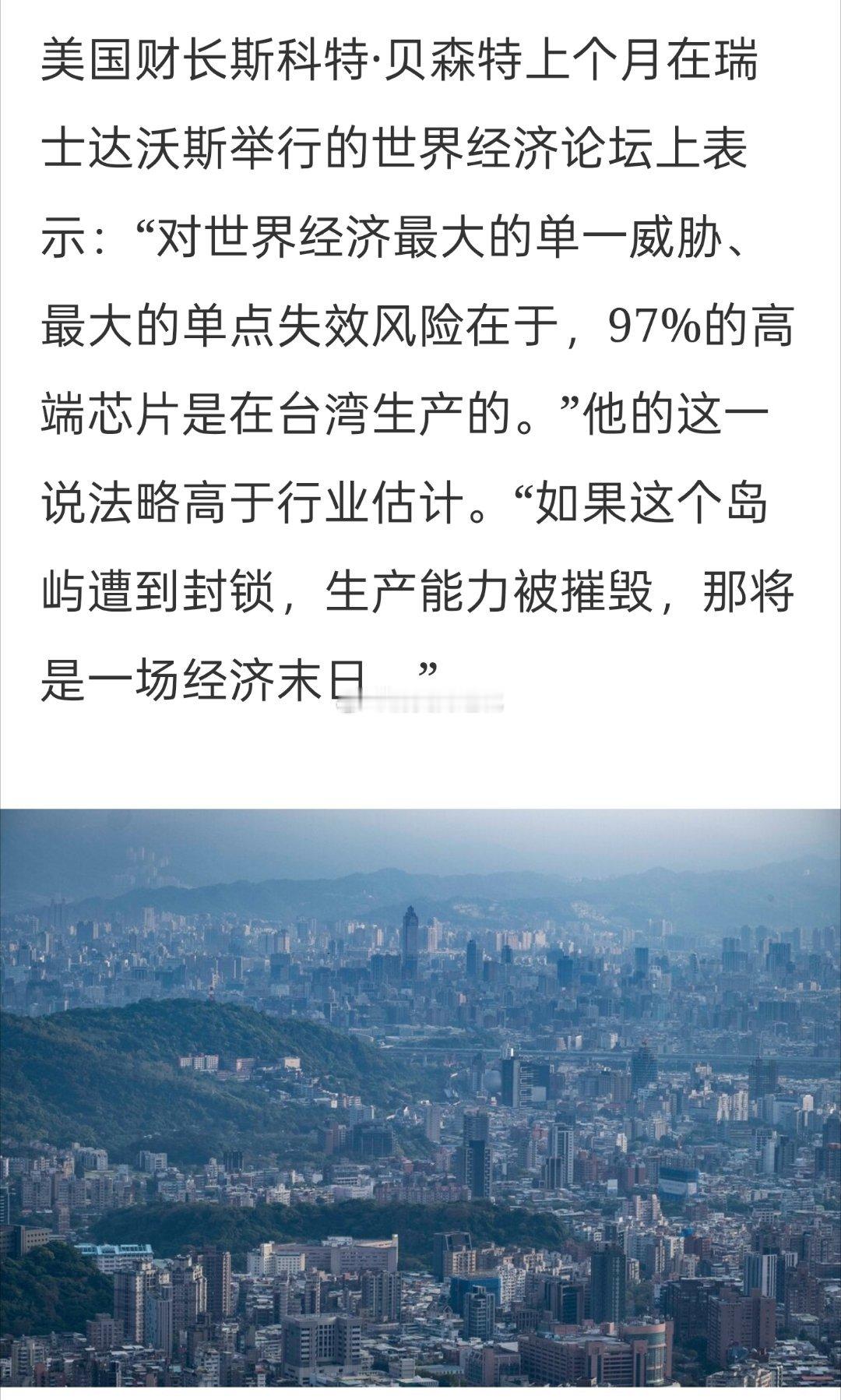 美国财长斯科特·贝森特上个月在瑞士达沃斯举行的世界经济论坛上表示:“对世界经济最大的单一威胁、最大的单点失效风险在于,97%的高端芯片是在台湾生产的。”他的这一说法略高于行业估计。“如果这个岛屿遭到封锁,生产能力被摧毁,那将是一场经济末日”。麦肯锡半导体业务全球联合负责人比尔·怀斯曼指出,企业高管往往认为,“‘如果我们完蛋了,其他人也都会完蛋’,所以他们不会采取行动。”