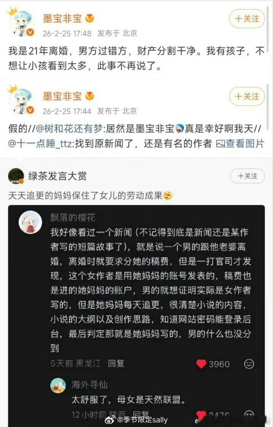 墨宝非宝辟谣了“离婚时母女联手保住稿费”的传闻,男方过错方