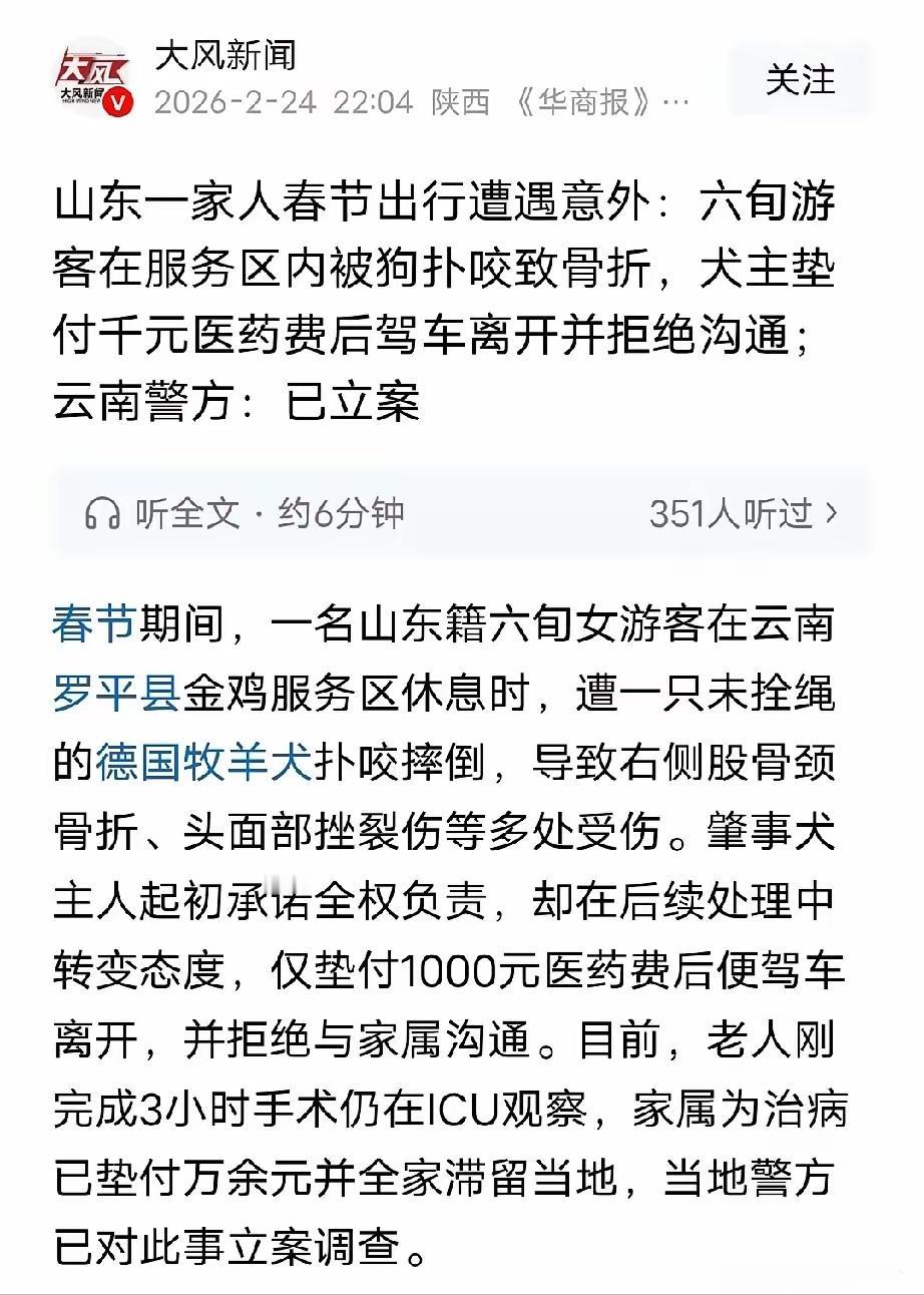山东籍女子一家到云南旅游,在服务区休息时,60多岁老母亲出去溜达,突然被一只未拴绳的德牧犬扑到,狗主人把狗撵回车上,但没关车门,不料,德牧再次冲出来直奔老人一顿撕咬,导致老人骨折,需要置换关节,狗主人一开始表示会全权负责医药费,后来,一听老人手术要2、3万,他付了1000元,开车逃跑,老人女儿给他打电话,狗主人说:一分钱没有,你爱怎样就怎样。女子再次报警,而医生告诉老人女儿,老人术后可能一腿长一腿短,这下女儿更焦心了,还好有个好消息让她松了一口气。 当天上午9点左右,小杨一家驱车抵达金鸡服务区,连续赶路的疲惫让他们决定停车歇脚。 小杨和丈夫忙着整理车辆,60多岁的老母亲则下车溜达,想呼吸新鲜空气、晒晒太阳,谁也没料到危险正悄悄逼近。 老人走到距离自家停车位十来米的地方时,一声急促的犬吠打破宁静,一只体型壮硕的德国牧羊犬从未关车门的车辆里猛地蹿出,直奔老人而去。 毫无防备的老人来不及反应,就被德牧狠狠扑倒在地,身体重重砸在水泥地上,钻心的疼痛瞬间席卷全身。 狗主人这时才慢悠悠下车,将狗吆喝回车内,可他明知狗已伤人,却没关车门,留下了致命隐患。 果不其然,亢奋的德牧趁着车门敞开,再次冲下车,对着倒地的老人疯狂撕咬,老人的哭喊声响彻服务区,脸上、胳膊上布满伤口,鲜血直流,场面触目惊心。 小杨夫妇听到哭喊后疯跑过去,看到母亲浑身是血、动弹不得的模样,心疼又焦急,立刻拨打了120和110,一边安抚母亲一边等待救援。 民警赶到后,狗主人却推卸责任,荒唐地声称是老人身上有特殊气味招惹了狗。 事实上,小杨一家车上虽有两只宠物狗,但事发时老人并未携带,也未与德牧接触,狗主人的狡辩不过是逃避责任的托词。 迫于现场压力,狗主人当场承诺全权负责医药费,还安排女儿陪同老人前往罗平县中医医院救治。 可这份承诺,终究没能抵得过金钱的考验。 医生检查后确诊,老人右侧股骨颈骨折、头面部挫裂伤、左侧上臂挫伤,加之年事已高且有腰椎手术史,无法打钢板,只能接受关节置换手术。 当狗主人得知手术费需两三万元时,态度瞬间转变,仅给小杨转了1000元,谎称用于购买住院用品,还要求小杨给老人走医保报销。 小杨咨询医生后得知,有第三方责任人时走医保属于骗保,是违法行为,将这话转告狗主人后,对方彻底撕破伪装,直言不走医保就一分钱不拿。 为了给母亲治病,小杨选择妥协,联系警方调解,提出先走医保,让狗主人承担剩余手术费和两万元后续治疗费,可狗主人百般推诿,双方僵持不下。 让人没想到的是,狗主人趁着调解间隙,悄悄驾车离开罗平,彻底失联。 小杨发现后打电话联系,对方只丢下一句“一分钱没有,你爱怎样就怎样”,便挂断电话不再接听。 更让小杨揪心的是,医生告知她,老人术后可能出现双腿长短不一的情况,以后走路或许会一瘸一拐,终身带残。 截至目前,小杨一家已垫付一万多元医药费,后续康复费用仍在增加,经济压力巨大。他们从山东千里迢迢而来,如今只能滞留当地,一边守护ICU的老人,一边奔波于派出所,无助又焦虑。 就在小杨一家一筹莫展时,好消息传来——罗平县公安局板桥派出所已正式立案,案件正在进一步办理中。 这起事件的核心,从来不是“狗伤人”,而是狗主人的漠视与不负责任。 狗本身没有对错,有错的是不履行监管责任的主人。 现实中,类似犬只伤人事件并不少见,去年某地就有未拴绳大型犬咬伤儿童,狗主人最终承担高额赔偿并受行政处罚。这些案例都在提醒我们,文明养犬是每一位养狗人的法定义务。 很多养狗人总说“我家狗不咬人”,可狗的兽性不可控,一句承诺无法抵消危险。这起事件中的狗主人,因一时疏忽和不愿承担费用逃避责任,毁掉了一位老人的晚年,也弄丢了自己的信誉。 躲得过初一,躲不过十五,狗主人可以暂时逃离,却逃不过法律的追责和内心的愧疚。 一场欢乐的春节之旅沦为悲剧,留给小杨一家的是伤痛与煎熬,留给所有养狗人的是深刻警示:养狗无界,责任有边,唯有守住法律底线、履行监管义务,才能避免类似悲剧重演。 希望这起事件能得到公正处理,希望老人早日康复,也希望每一位养狗人都能引以为戒,用责任守护他人安全,不让“恶犬伤人”的悲剧再上演。