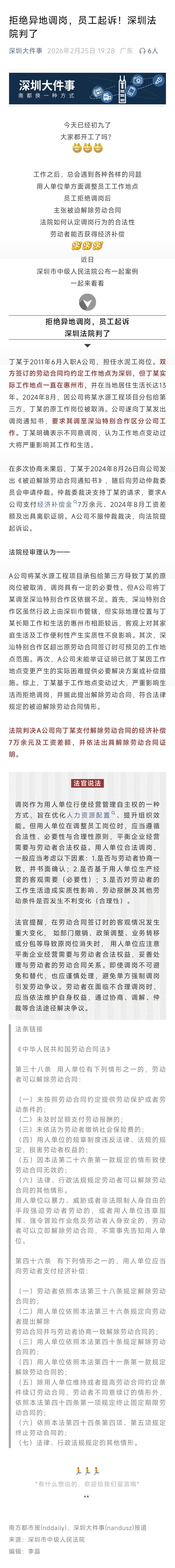 #员工拒绝异地调岗起诉公司获赔偿#【拒绝异地调岗,员工起诉!深圳法院判了】#员工拒绝调岗起诉公司获赔7万多#工作之后,总会遇到各种各样的问题,用人单位单方面调整员工工作地点,员工拒绝调岗后主张被迫解除劳动合同,法院如何认定调岗行为的合法性,劳动者能否获得经济补偿?近日,深圳市中级人民法院公布一起案例,一起来看看。