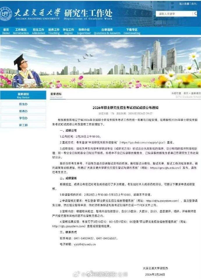 【#部分院校已公布考研查分时间#】截至2026年2月26日,辽宁等地已明确考研初试成绩将于2月28日10:00起陆续公布(如辽宁大连民族大学、大连交通大学等院校),但仍有部分地区尚未发布具体通知,考生需以报考院校或省级教育考试院官方公告为准。 (综合网络)#肖秀荣怒斥假消息影响考生心态##考研成绩#