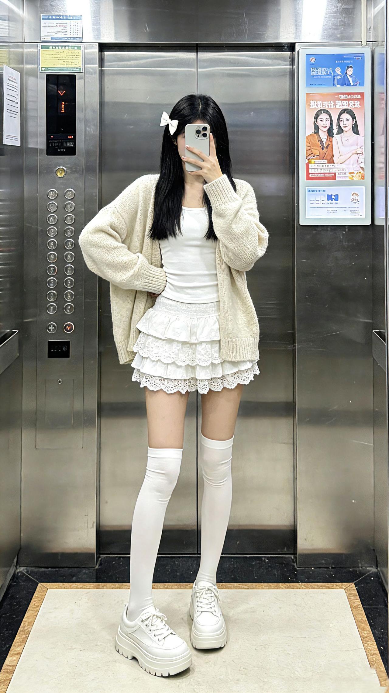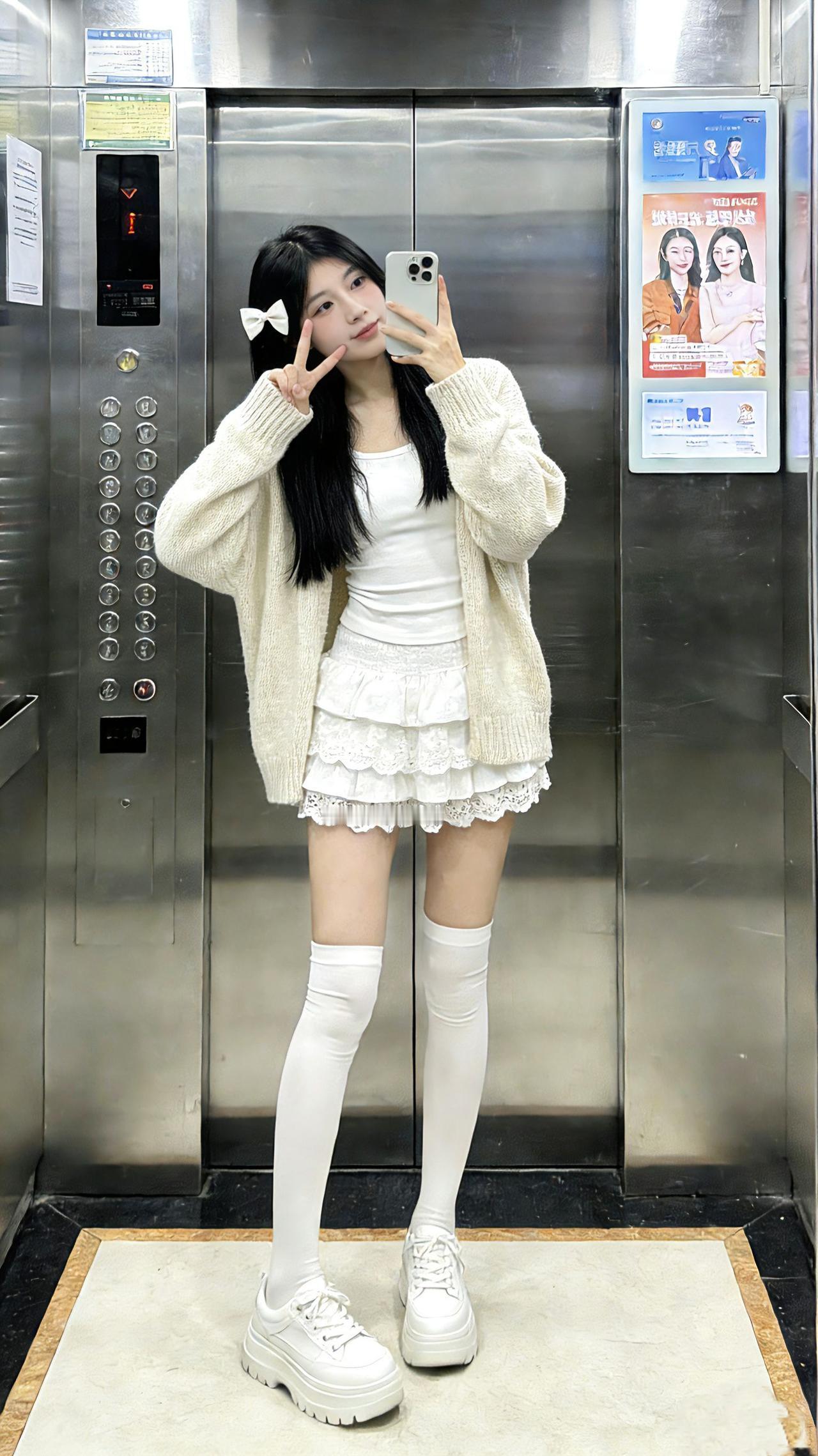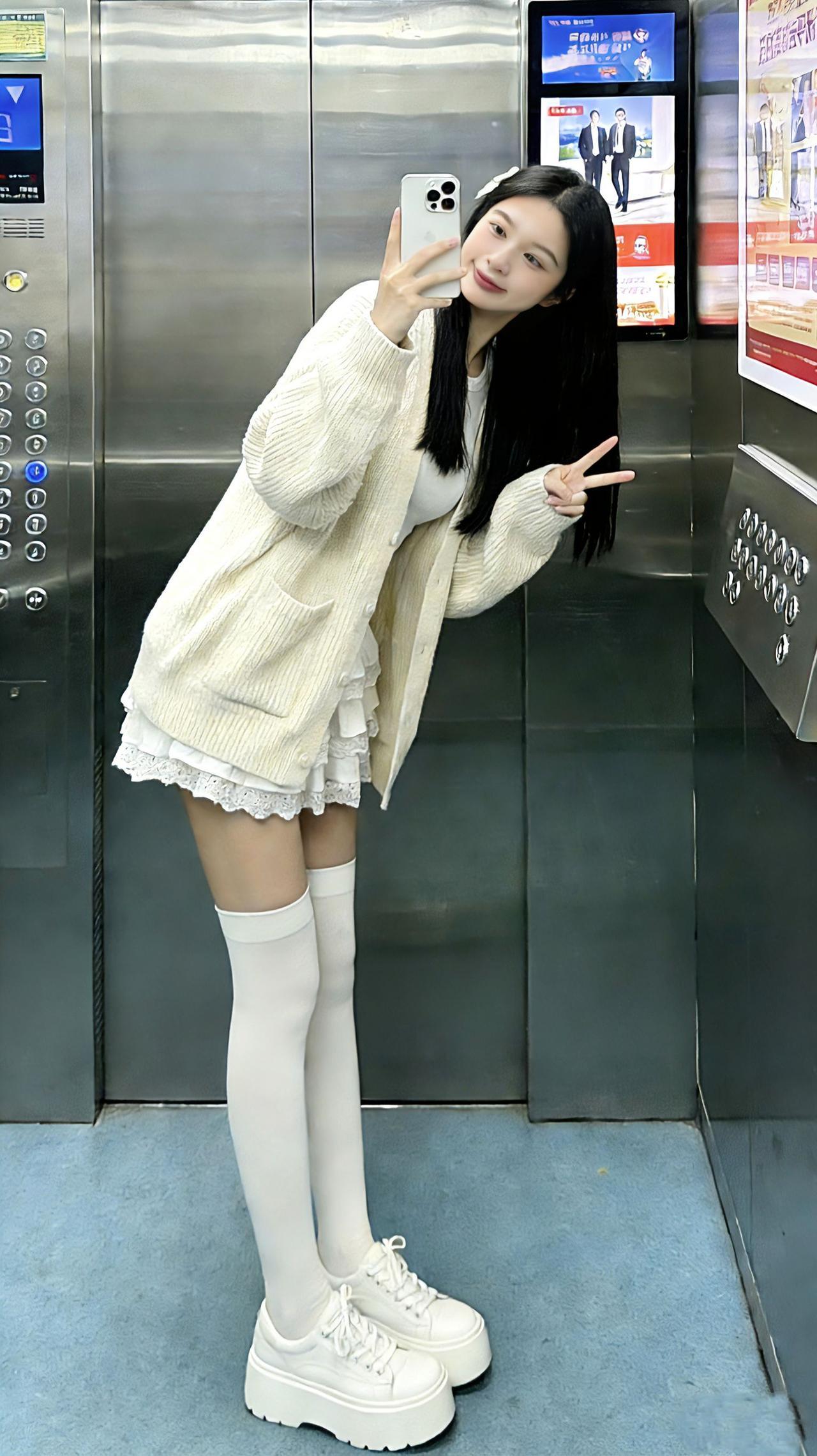 电梯间里,奶白针织裹着云朵般的软甜,蕾丝花边裙一摆像把温柔揉进了穿搭里~过膝白袜配厚底鞋,初恋感甜得刚好不腻!甜美女孩 白月光穿搭 短裙穿搭 温柔风穿搭