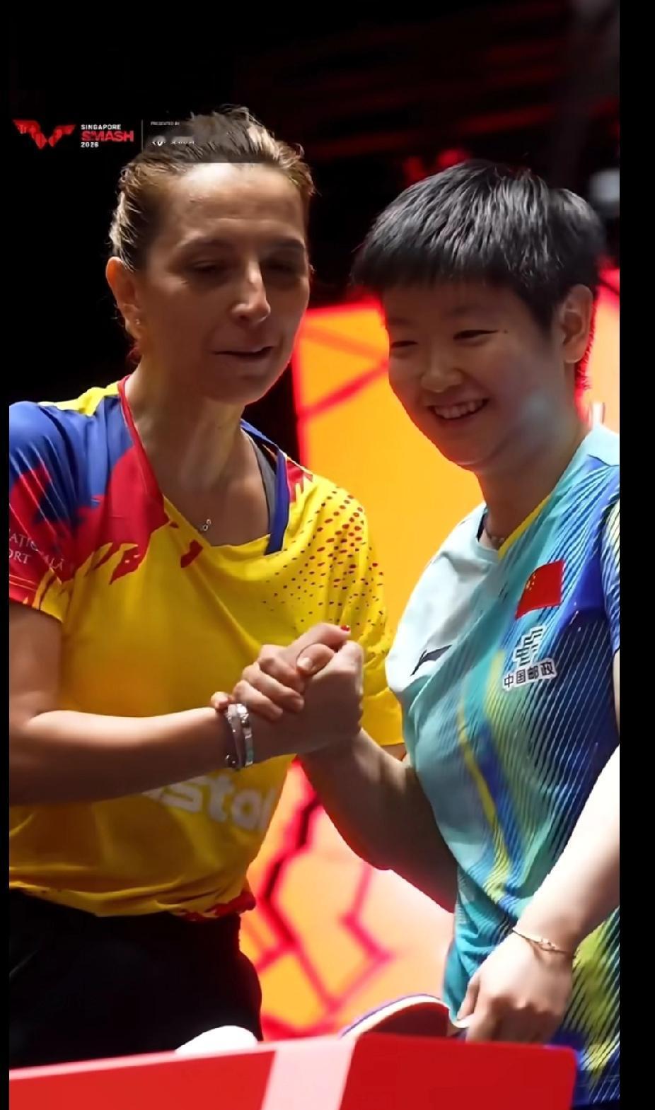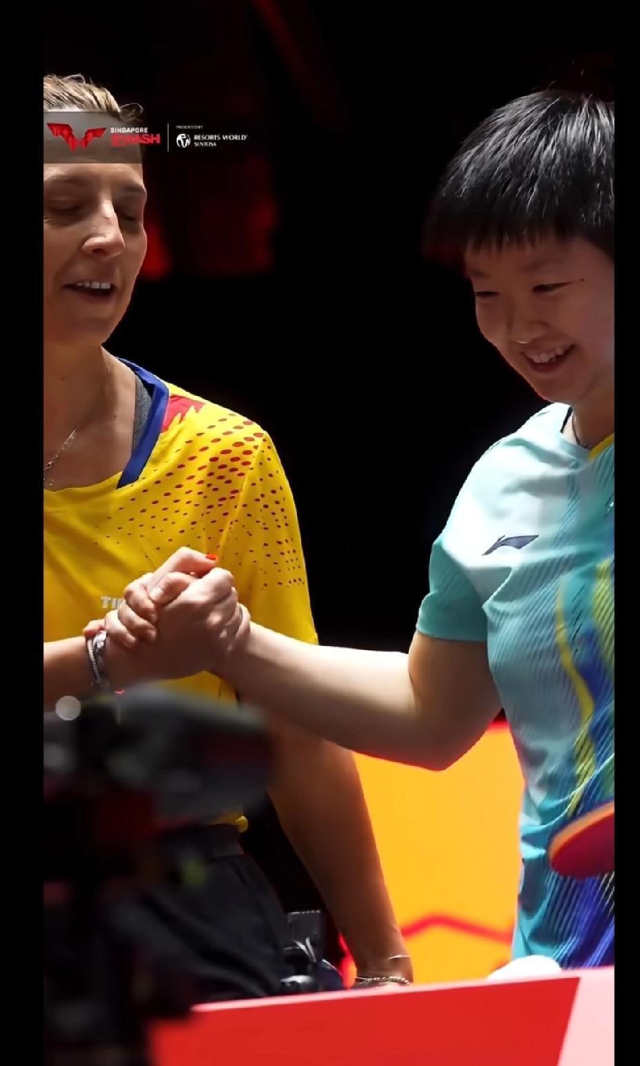 这一握,是敬意,更是格局✨ WTT新加坡大满贯的赛场,孙颖莎和罗马尼亚老将萨马拉的赛后握手,成了比胜负更动人的画面。 萨马拉紧紧握着莎莎的手,眼神里满是欣赏与感激,久久不愿松开;而莎莎眉眼弯弯,笑得又暖又甜。这一幕,哪里是对手间的告别,分明是老将对后辈格局的由衷敬佩。 比赛中,当裁判判罚萨马拉发球违例,老将一脸无助时,莎莎没有选择“收下”这一分,反而主动提醒她:“你不挑战吗?”,还比划着鹰眼挑战的手势。正是这份坦荡,让萨马拉成功挑战,拿回了本该属于自己的分数。 赛场上,她是所向披靡的“小魔王”;赛场边,她是守住公平的暖心姑娘。这一握,握的是实力,更是人品;敬的是对手,更是体育最本真的模样。 这样的莎莎,谁能不爱呢?❤️ 孙颖莎 新加坡大满贯