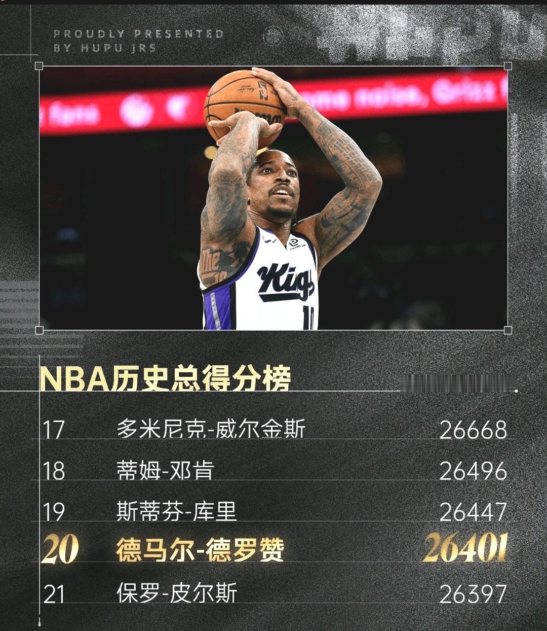 闷声发大财,德罗赞总得分26401,来到历史第20位,距离库里只差46分! 今