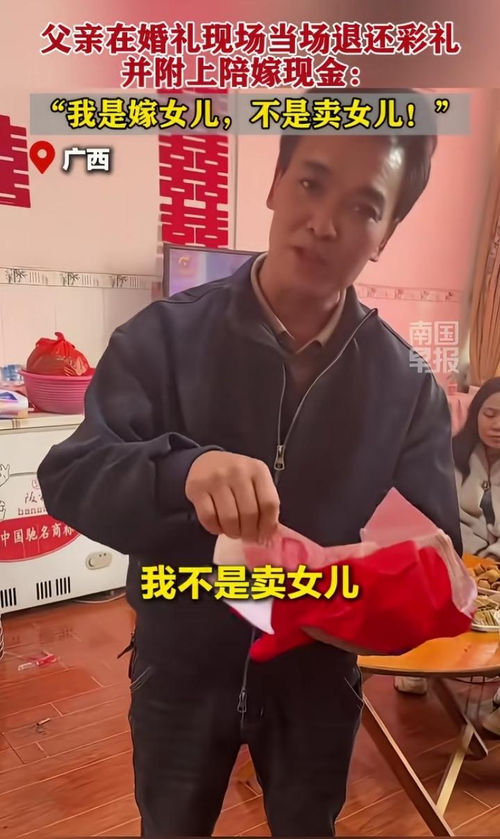 广西,女儿出嫁,男方送来彩礼,父亲当场全部退回,只留下两百块,说意思一下就好了,还拿出一沓陪嫁现金。一句“我是嫁女儿,不是卖女儿”,直接戳中无数人。 这位父亲看得太通透了:钱换不来幸福,女儿的底气和尊严才是最重要的。 留下两百块是礼数,退回的彩礼是体谅,陪嫁是给女儿的靠山。这样明事理、有格局的父母,才是孩子婚姻里最好的底气。 愿每一个姑娘出嫁,都能被这样温柔以待,不被彩礼绑架,只被真心守护。