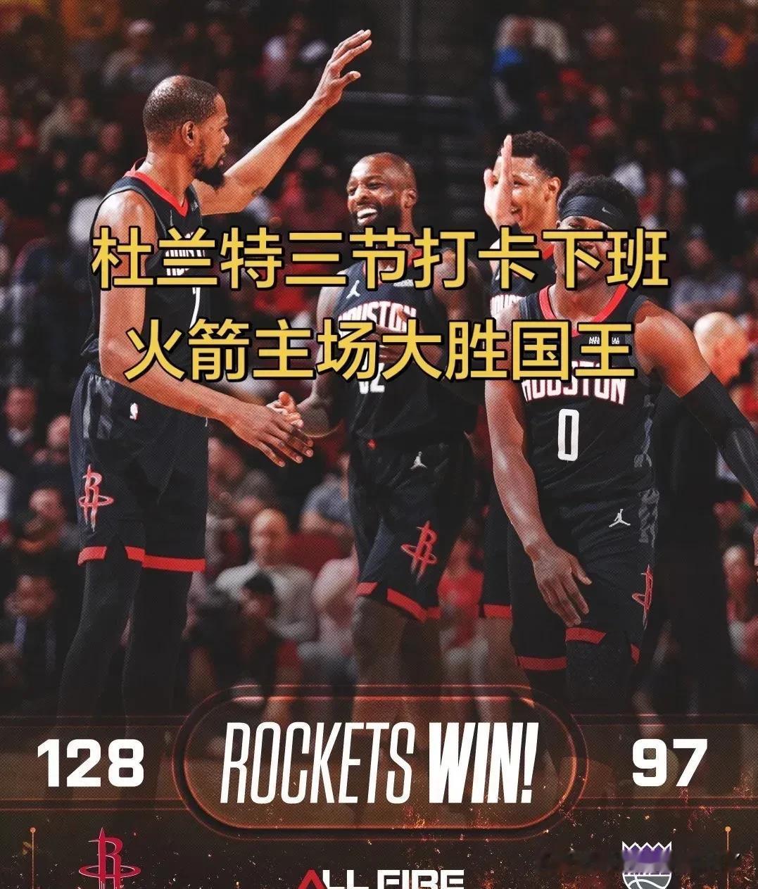 狂胜31分,真的太解气了!火箭今天直接把国王按在地上摩擦,128-97狂胜31分,两连胜稳坐西部第三。看完比赛只想说:这支火箭真的要起飞了! 火箭今天这球,分明是单方面碾压,从第一节就没给对手留活路。谢泼德今天像是开了挂,三分球投得嗖嗖响,28分进账跟玩似的。 手起刀落间,国王的防线被戳得全是窟窿,他站在三分线外一抬手,对手就只能眼睁睁看球进网,这手感热得能烫死人。 申京更别提了,26分13篮板11助攻,三双拿得跟喝水一样轻松。内线里他跟个小坦克似的,攻防两端都横着走,抢篮板时对手根本挤不过他,传球还总能精准送到队友手里,国王的内线被他搅得像一锅粥,乱成一团。 杜兰特呢?还是那副稳当样子,三节拿了21分就下班歇着了。他往场上一站,火箭的军心就定了,进攻时抬手就能得分,防守时对手也不敢轻易闯他的防区,说是定海神针一点不夸张。 这三人往场上一摆,火箭的进攻就像开了闸的水,挡都挡不住。第一节就把分差拉开,半场领先27分,第三节打完直接进入垃圾时间。 国王那边拼到最后,也就威少还能硬撑着拿22分,德罗赞和蒙克像是被抽了魂,投篮打铁,防守漏人,完全跟不上火箭的节奏。 最让人叫绝的是火箭的深度,末节杜兰特和主力们歇着,替补上来照样能守住优势,没给国王任何翻盘的机会。这哪是某个人的爆发?分明是全队拧成一股绳,攻防两端都透着股狠劲。 看完这场球总算明白,火箭这是真要发力了。有杜兰特镇着场子,申京肉眼可见地在成长,再加上谢泼德这种说爆就爆的火力点,西部诸强怕是得捏把汗了。 就这状态打下去,谁想拦他们,怕是得先掂量掂量自己的斤两!