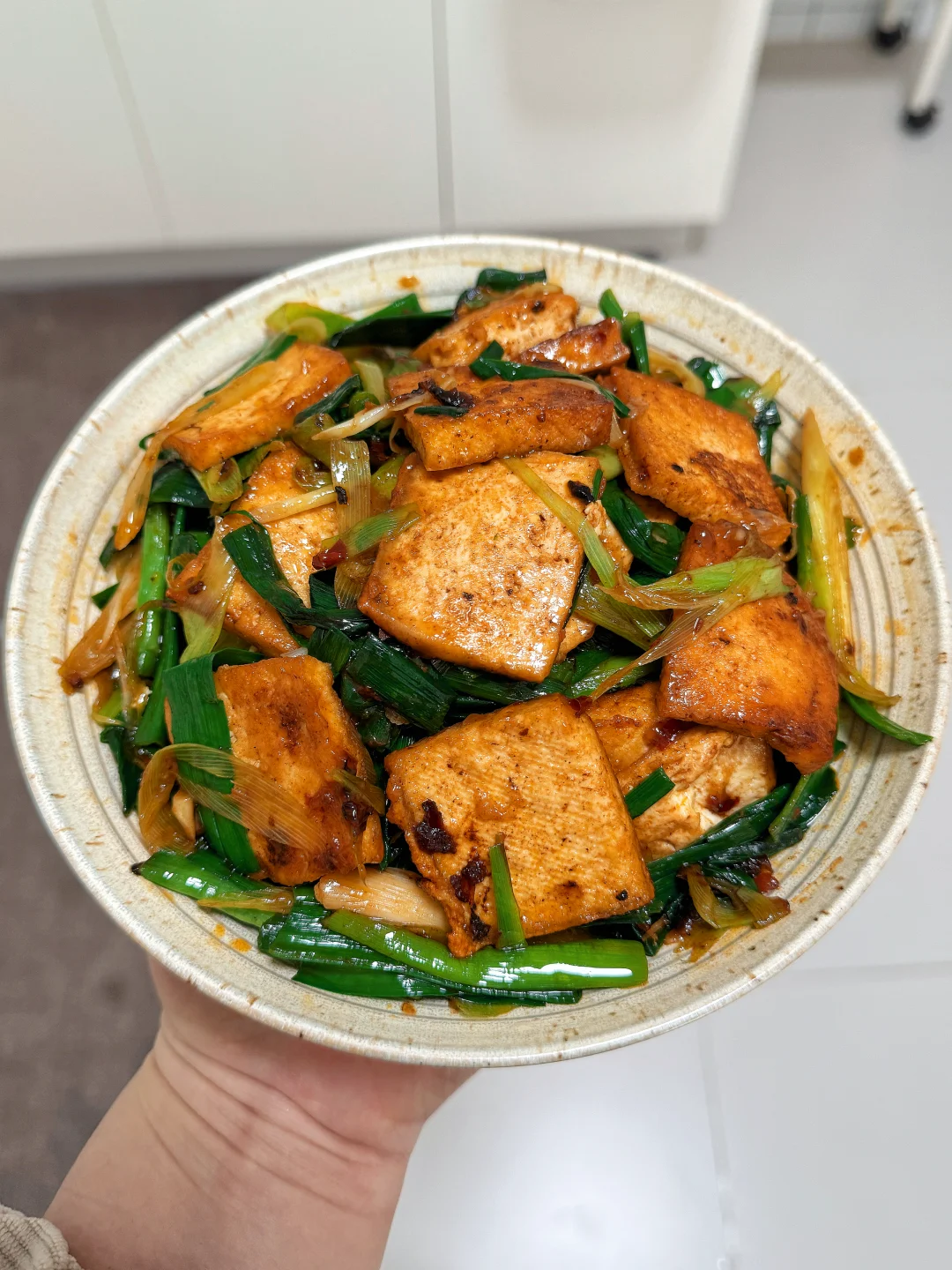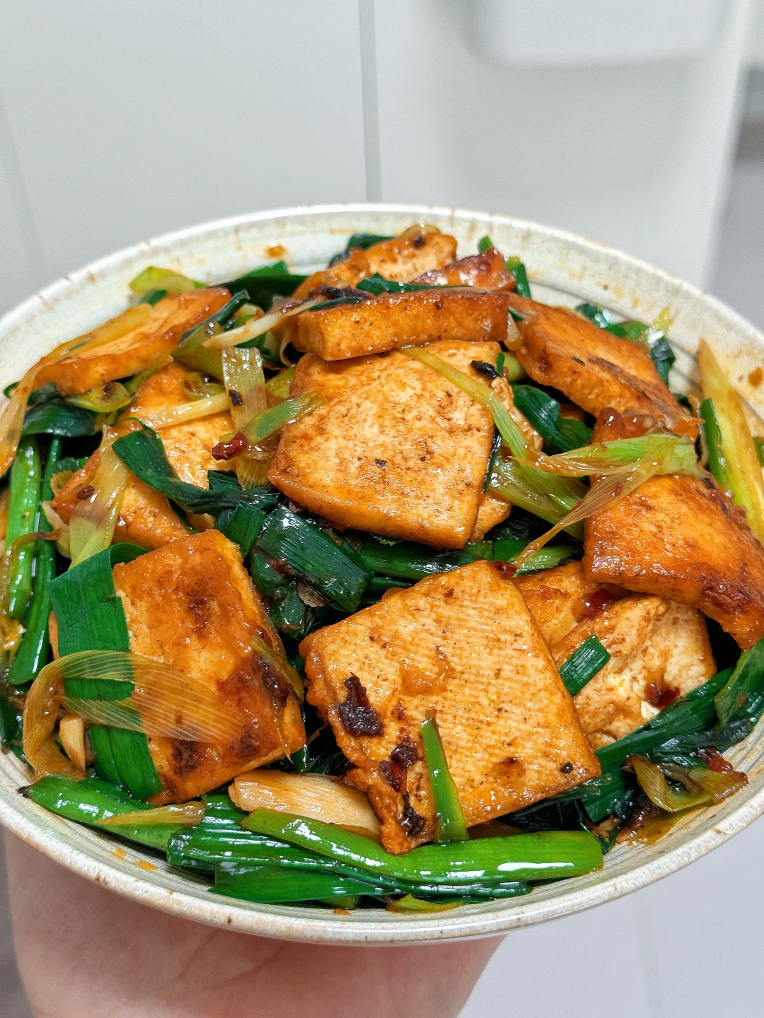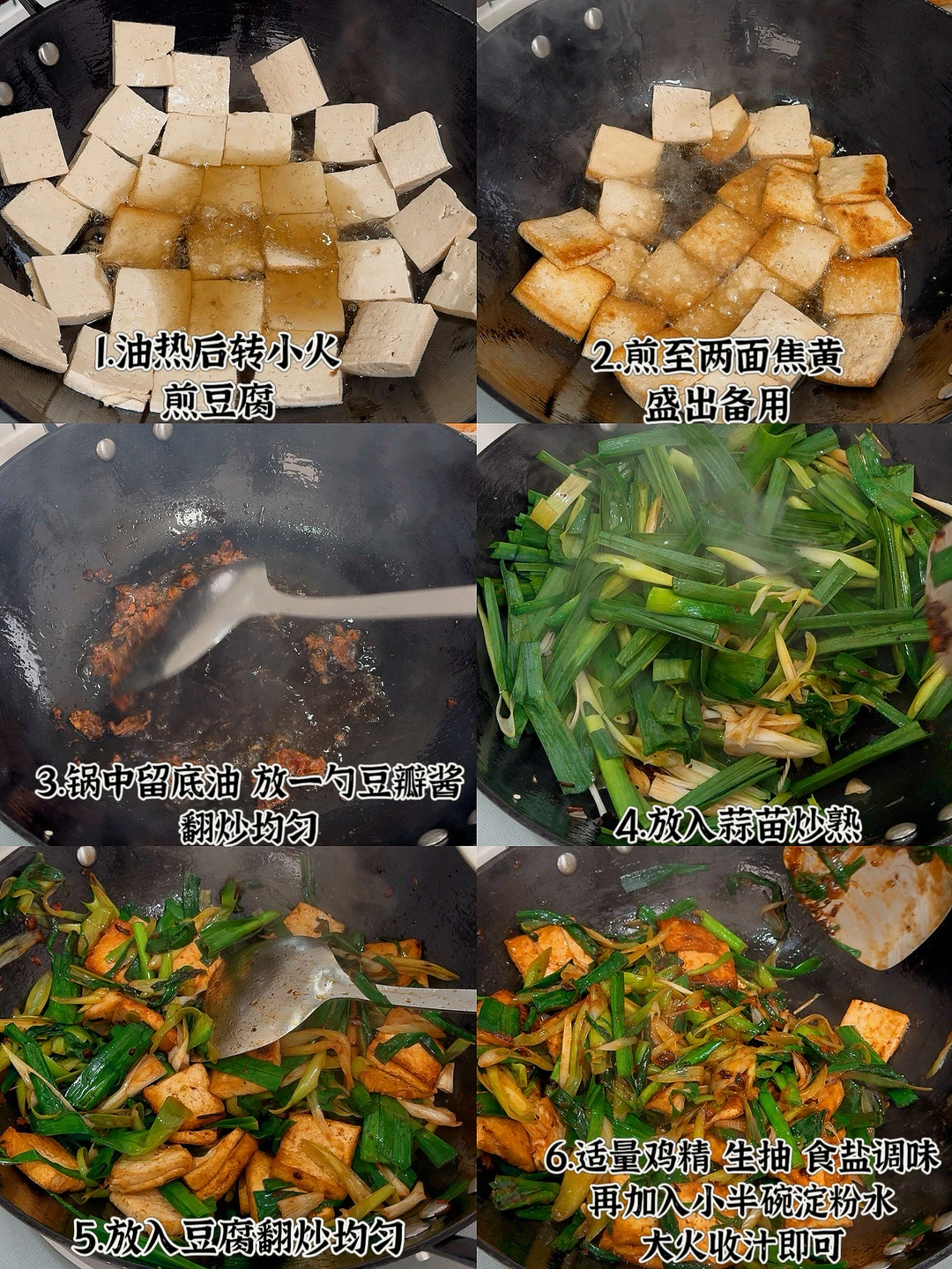 📜食材:豆腐、蒜苗 🍳做法: 1.油热后转小火,放入豆腐煎至两面焦黄,盛出备用 2.锅中留底油,放一勺豆瓣酱翻炒均匀 3.放入蒜苗炒熟 4.再次倒入豆腐,翻炒均匀 5.放适量鸡精,食盐,生抽调味,再加小半碗淀粉水收汁即可。
