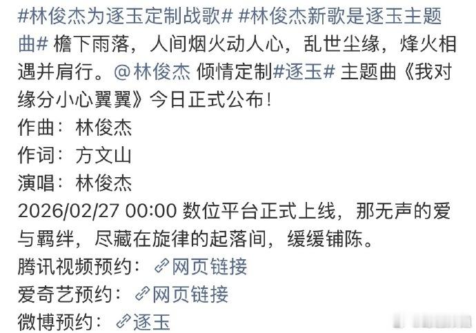 演唱林俊杰作词方文山逐玉主题曲作词方文山 林俊杰方文山再度联手!这次是为《逐玉》创作主题曲《我对缘分小心翼翼》,这俩人合作的每一首都是经典,这首肯定也不例外!