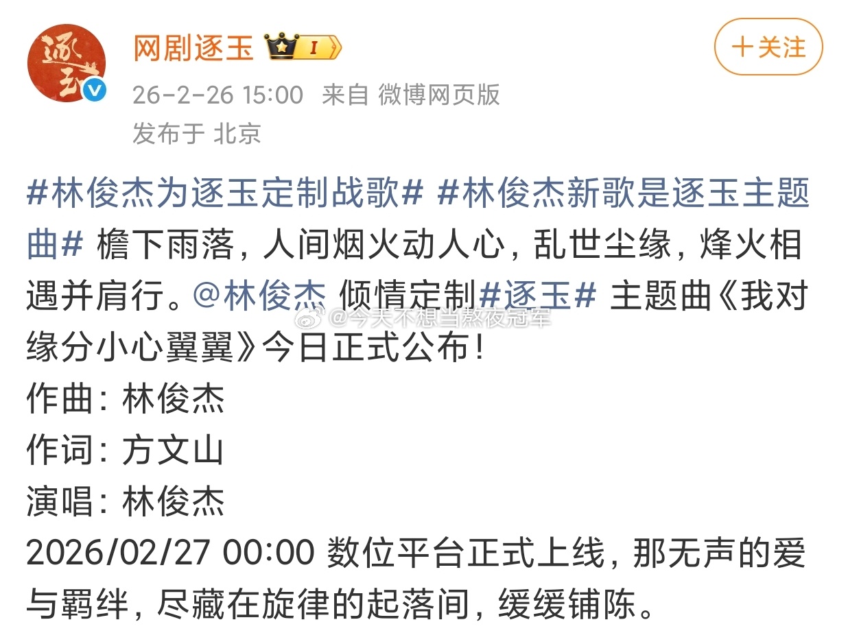 哦莫,这个《逐玉》的ost配置,林俊杰唱,方文山作词林俊杰田馥甄逐玉双平台预