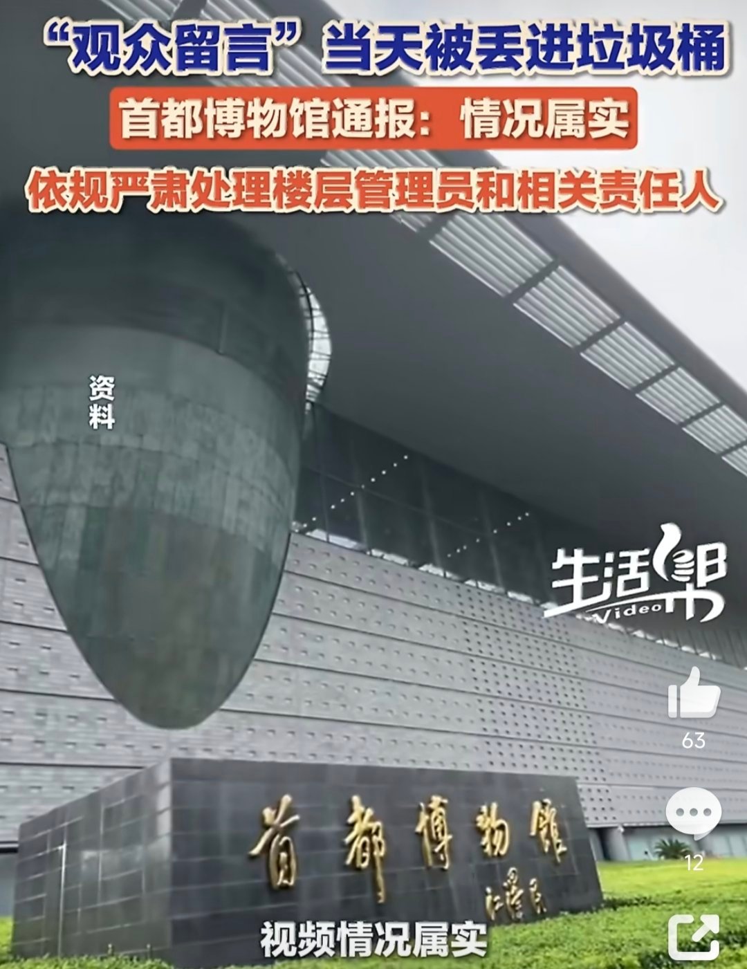 留言纸被弃垃圾桶寒了观众真心满怀真心写下的留言,转眼被当成垃圾丢弃,实在令人心寒。观众走进首博,是为感受历史、表达热爱,那些文字里有感动、有建议、有童真。被弃置垃圾桶的不只是纸张,更是大家的赤诚心意。文化场馆不该只有冰冷的文物,更要有温暖的服务与尊重。希望此事能敲响警钟,善待每一份留言,守护好观众对博物馆的热爱与期待。