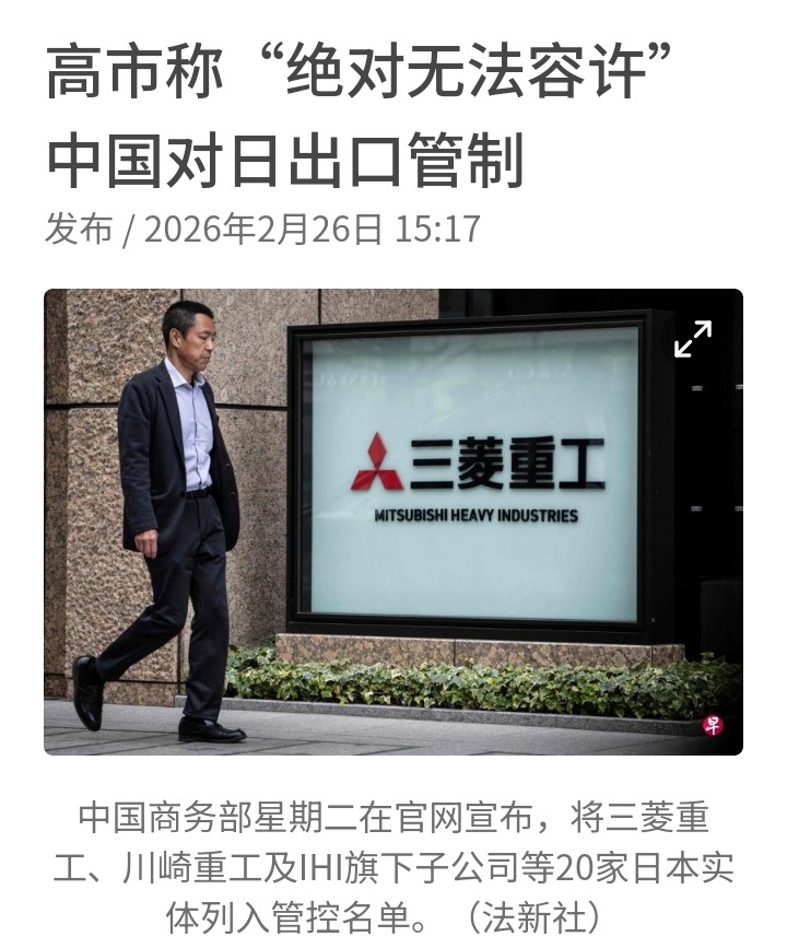日本首相高市早苗说,“绝对无法容许”中国对日出口管制。据共同社报道,高市早苗今天(26日)在参院代表质询中,就中国宣布将日本防卫相关企业等列入出口管制管控名单一事表示:“决对无法容许,令人极其遗憾。我们已强烈抗议并要求撤回该措施。”