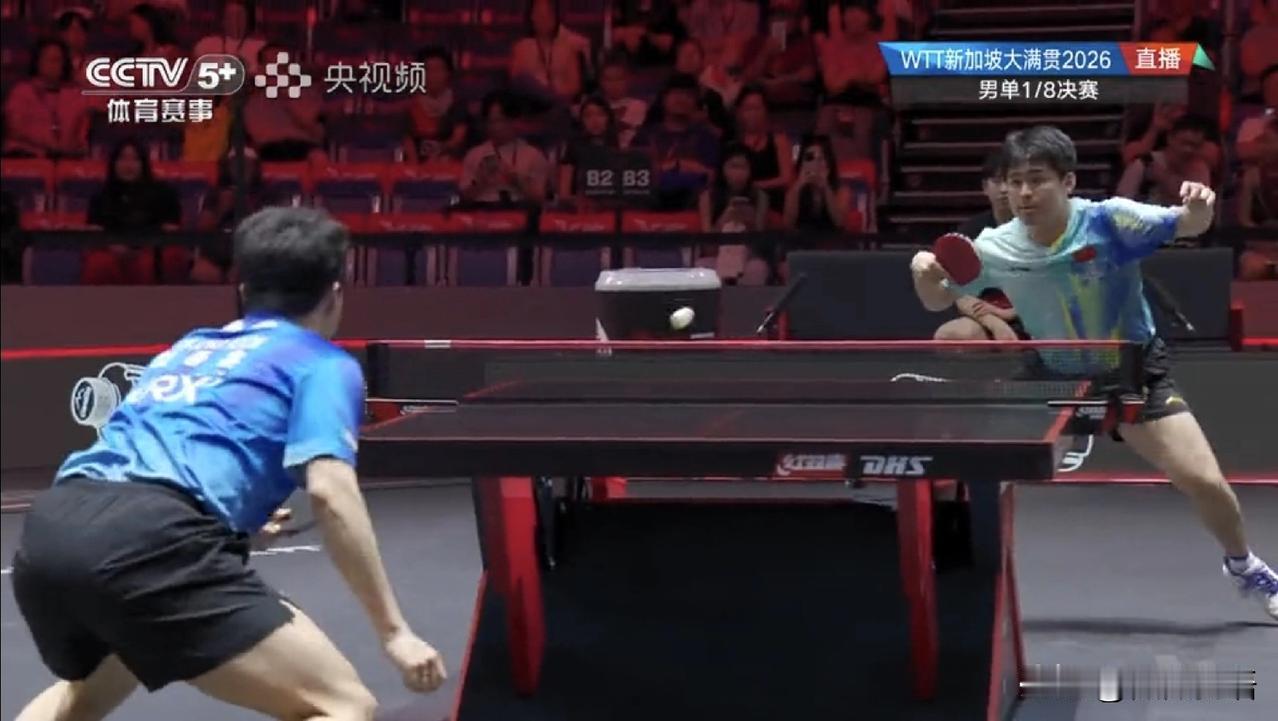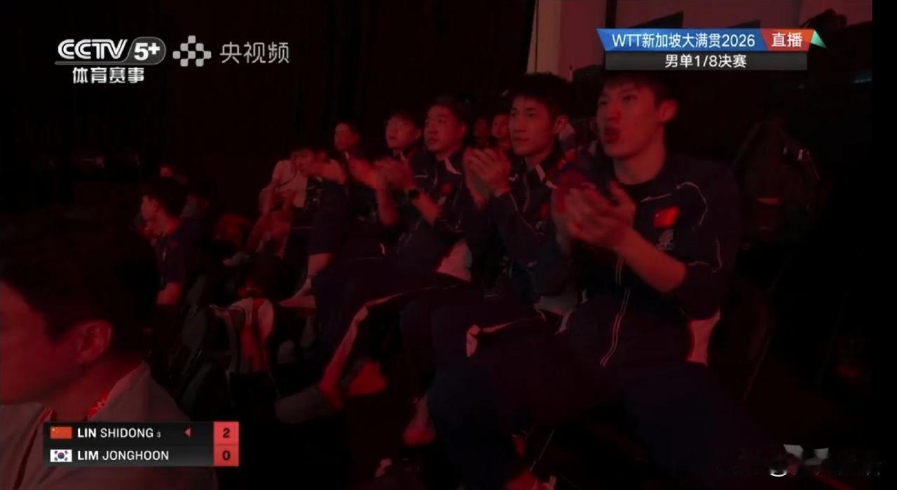 陈俊菘和黄友政来看林诗栋比赛了。 今晚一号台的第一场比赛是林诗栋对阵林仲勋,林诗栋的场外是王皓,刚刚镜头给到观众席,看到刘恒教练带着陈俊菘、黄友政在看比赛,大壮也在,林诗栋打出好球时,黄友政也在台上给搭档很用力的鼓掌。 这次新加坡大满贯赛,刚刚林诗栋在打比赛时也喊出来了,眼神特别的坚定,看得出来赛前做了充分的准备。林仲勋前面打的不错,而且他和申裕斌的混双也打进决赛了。但是林诗栋的状态更好一些,前面两局林诗栋是11-5、11-4赢下,大比分2-0领先。 到了第三局两个人的比分一开始比较胶着,林仲勋在开局时也把暂停用了,林仲勋也是连续追分,把比分追到了8:9,林诗栋10:8拿到赛点时,看到王皓站起来给林诗栋鼓掌了。解说说林诗栋赛前对林仲勋也是做了很充分的准备,不过赛末林仲勋是全力搏杀,还是很顽强,把比分追到了10平,刚刚林仲勋的一个幸运球又得一分,局点林仲勋发球又被裁判罚了一分,林仲勋提出挑战,看到发球角度40.44,林仲勋挑战失败,这一分球对林诗栋也很重要,俩人比分来到11平,最终林仲勋16-14扳回一局。 现在还要继续打第四局,林诗栋大比分2-1领先,如果第三局在9:8时叫暂停,会不会好一点呢。希望第四局林诗栋能调整好状态,争取拿下,千万不要拖到决胜局,林诗栋加油!