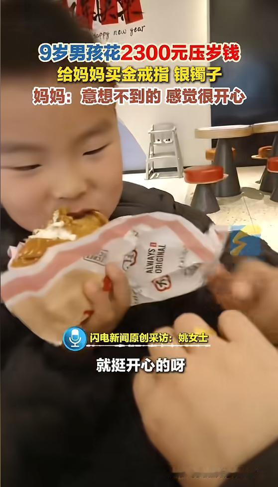 这孩子是来报恩的吧!浙江嘉兴,男孩过年收了3000元的压岁钱,这天妈妈发现孩子偷偷拿着压岁钱出门,本来担心他会乱花钱,结果孩子回来后却拿着一个金戒指和银手镯给到妈妈,妈妈差点当着孩子的面就哭了出 姚女士的儿子今年9岁,这孩子过年收了3000块压岁钱,揣在兜里还没捂热乎呢,就偷偷出了门,姚女士还发现他的压岁钱也一起给带走了,当时她还担心,孩子不会是祸祸那些玩具卡片或者游戏充值了吧 结果呢?孩子回来的时候,手里攥着一个小袋子和一杯奶茶。他把东西往妈妈跟前一递,姚女士打开一看,愣住了,里面躺着一个金戒指和一个银手镯 还没等她反应过来,孩子随口蹦出来一句话,直接让她鼻子一酸,眼泪差点掉下来。孩子说:给妈妈花钱,我一点也不心疼 原来,这小家伙是去金店了。平时妈妈念叨过想要的首饰,他都记在心里。凭着这点记忆,用那3000块压岁钱,给妈妈置办齐了。顺道还绕去奶茶店,买了妈妈最爱喝的那一口。完事儿一路小跑回家,就想看看妈妈惊喜的样子 不得不说,这个孩子是真懂事,9岁的年纪,正是看见零食走不动道、可这孩子,愣是把这么大一笔“巨款”,一分没留,全换成了妈妈的首饰 不过话说回来,那金店的老板胆子也够大的。一个9岁的小孩,拿着几千块钱来买金戒指,店员居然就这么卖了? 这要换个思路想,万一这孩子是偷拿了家里的钱,或者是个压根不懂事的“小败家子”,那这买卖肯定得闹纠纷,结局可就不是感动,而是愤怒了 严格来说,8岁以上的孩子属于限制民事行为能力人,只能进行与其年龄、智力相适应的小额消费。花3000块买金首饰,显然超出了这个范畴。如果家长不认账,这笔买卖是有可能被认定为无效的 对此,你怎么看呢?
