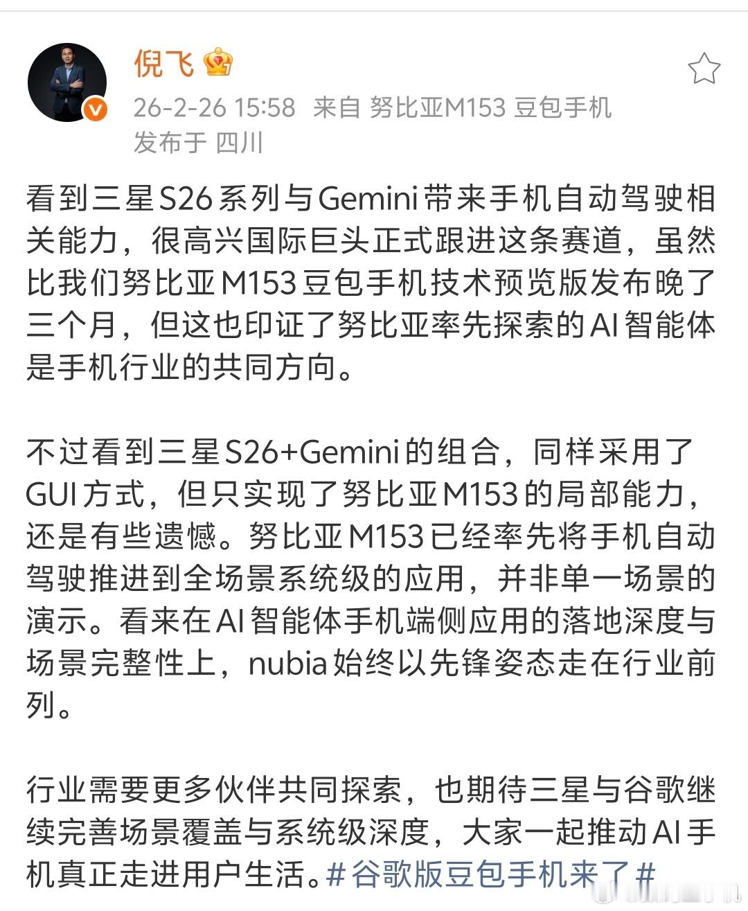 努比亚总裁倪飞回应谷歌版豆包手机高管称S26只实现豆包手机局部能力三星S26系列正式发布,值得一提的是与Gemini合作能带来手机自动驾驶相关能力,比nubia M153豆包手机技术预览版发布晚三个月,不过印证了努比亚率先探索的AI智能体是行业共同方向。