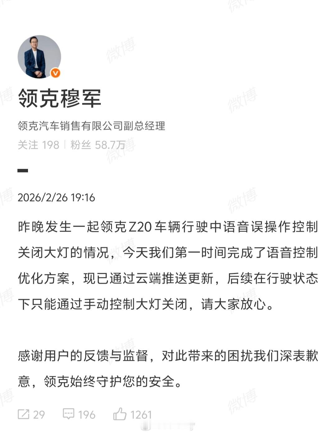 领克的动作很快,“第一时间完成了语音控制优化方案,现已通过云端推送更新,后续在行驶状态下只能通过手动控制大灯关闭”。大家可以试试自己的车在行车中能不能用语音助手关闭大灯,我在群里已经看到另一个品牌的也可以在行车中关闭大灯了。新能源汽车领克