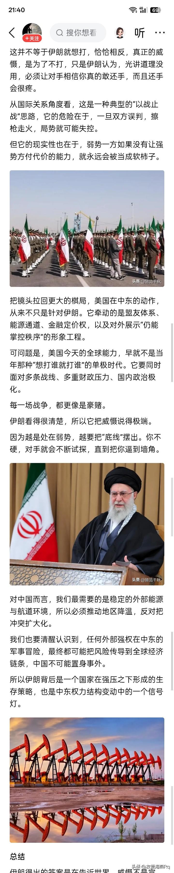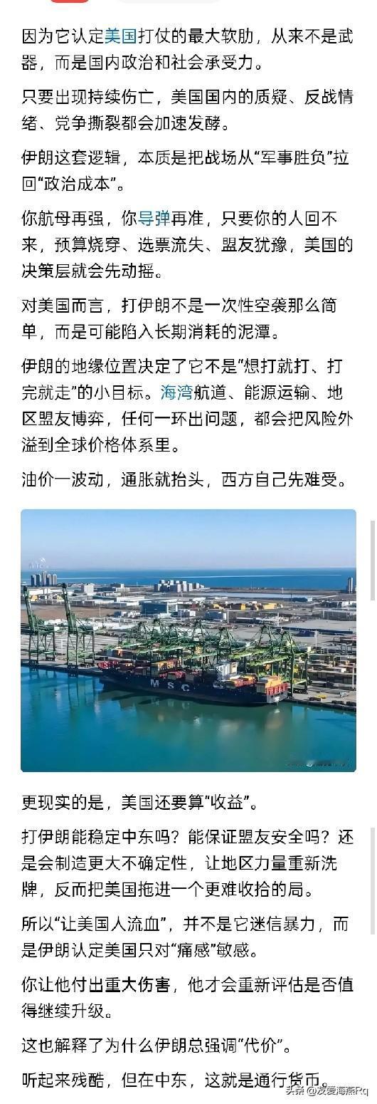傻喷? 有些人写文章,除了流着口水傻喷之外,似乎啥也没有。 让美国人流血?对美国造成重大伤害?这种鲜血直流,楼塌人死的事情,不是谁都愿意做的,与此同时,也不是谁都可以做得到的。 简单的问一句,光说让美国人流血,用什么办法让美国人流血?大概不是爆炸、暗杀等等恐怖主义行为吧。如果真的是让美国人流了血,尝尝随后产生的后果是个啥滋味,估计狂热的头脑才会冷静和清醒一些。 任何事情都必须知己知彼,都必须看清楚目前客观的、现实的、实实在在的条件,仅仅靠大嘴喷出来的雄心壮志,勇猛顽强,没有任何卵用。如果真要说还有点什么作用的话,无非是将伊朗人向火堆里推,诱惑他们走进无底深渊。 什么美国国内的政治和承受力?从上世纪70年代后,美国囯内的政治和社会承受住了美国所有进行的战争。因为现代美国进行的战争,早已经不是50年以前的战争,如果美国军队使用空军战斗机攻击伊朗,别说是让美国人流血,伊朗军队就是看一眼美国人,恐怕都是个难题。
