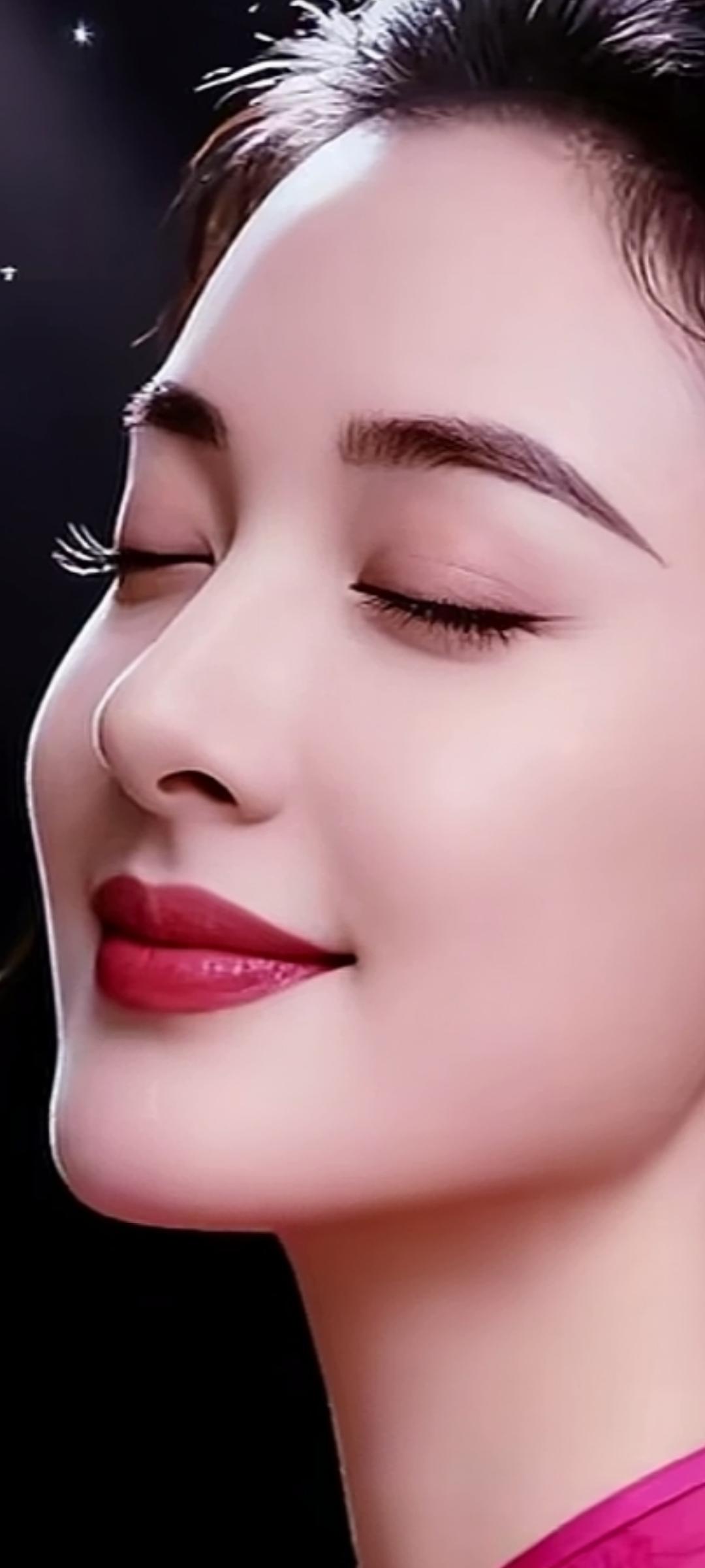闭眼微笑,温柔如水,红唇轻启,优雅动人。
