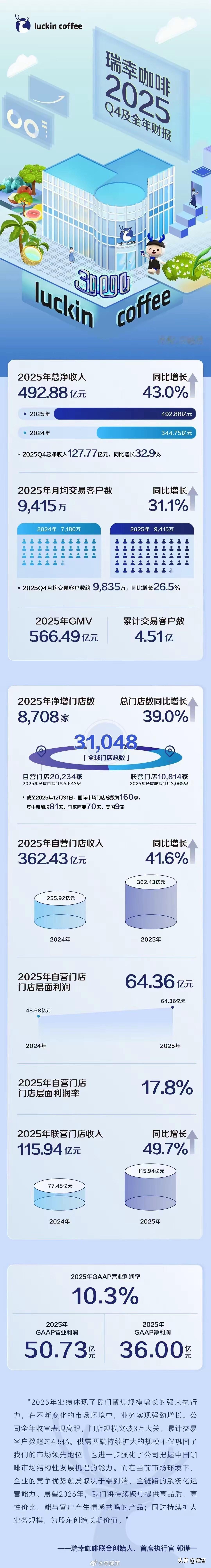 瑞幸咖啡2025年财报数据显示爆发式增长,那么星巴克、库迪、MANNER和M-Stand呢? 瑞幸咖啡 在咖啡行业“价格战”与“规模战”并行的背景下,瑞幸咖啡凭借“高性价比+高密度覆盖”的策略,在2025年实现了爆发式增长。 1、总净收入达492.88亿元,同比增长43.0%。 2、门店总数突破3.1万家,月均交易客户数达9,415万。 3、GAAP营业利润率为10.3%。 星巴克 1、星巴克中国2025财年收入为31.05亿美元(约合人民币220.77亿元),同比增长5%。 2、门店数为8,011家,同店销售额连续两个季度正增长。 瑞幸与星巴克对比 1、从增长速度看,瑞幸在收入、门店扩张和客户规模上均大幅领先星巴克中国,体现了其“高性价比+高密度覆盖”的策略成功。 2、瑞幸的联营门店(加盟)收入增长达49.7%,显示其轻资产模式在下沉市场和快速扩张中更具优势。 3、星巴克中国虽保持盈利健康,但增长乏力,正通过下沉市场和股权出售寻求突破。 4、两者在战略上形成鲜明对比:瑞幸主打规模与效率,星巴克则坚守品牌与体验。 库迪咖啡 库迪咖啡以“9.9元价格锚点+零加盟费+轻资产小店”为核心打法。 1、2025年2月全球门店达10,045家,计划2025-2027年新增4万家便捷店,目标是“百米之内有库迪”。 2、库迪的平均单杯成本为11.1元,远超9.9元定价,高度依赖外卖的低价品牌,平台佣金、隐形推广费等支出并不低,会挤压利润空间。 MANNER咖啡 MANNER咖啡主打“高性价比精品咖啡”,其核心竞争力在于“精品咖啡+高性价比”,通过“咖啡+烘焙”模式提升客单价和复购率。 1、2025年门店数约1,500家,主要集中在一线及新一线城市。 2、客单价约15-20元。2025年MANNER咖啡收入约30亿元,同比增长50%,净利润约3亿元,同比增长60%。 3、MANNER咖啡的扩张策略是“聚焦高线城市+高密度覆盖”,目标是“每平方公里1家店”,通过高密度覆盖提升品牌认知度和客户粘性。 M-Stand咖啡 M-Stand咖啡主打“精品咖啡+生活方式”,通过“咖啡+烘焙+轻食”模式提升客单价和复购率。 1、2025年门店数约800家,主要集中在一线及新一线城市。 2、客单价约30-40元。2025年M-Stand咖啡收入约20亿元,同比增长40%,净利润约2亿元,同比增长50%。 3、M Stand咖啡的扩张策略是“聚焦高线城市+高密度覆盖”,目标是“每平方公里1家店”,通过高密度覆盖提升品牌认知度和客户粘性。