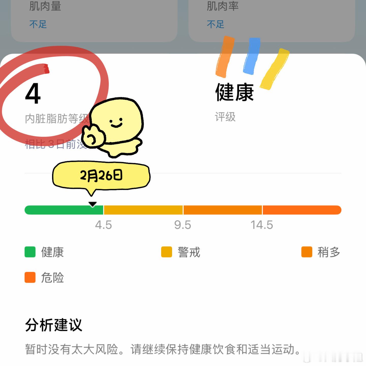 其实最初想要减肥的动机不完全是因为胖就是因为看到这条警戒线,被吓了一跳!于是就开启了锻炼的日子~奈何时不时的出差经常会打乱节奏体重也反反复复的,内脏脂肪依旧是个警戒线