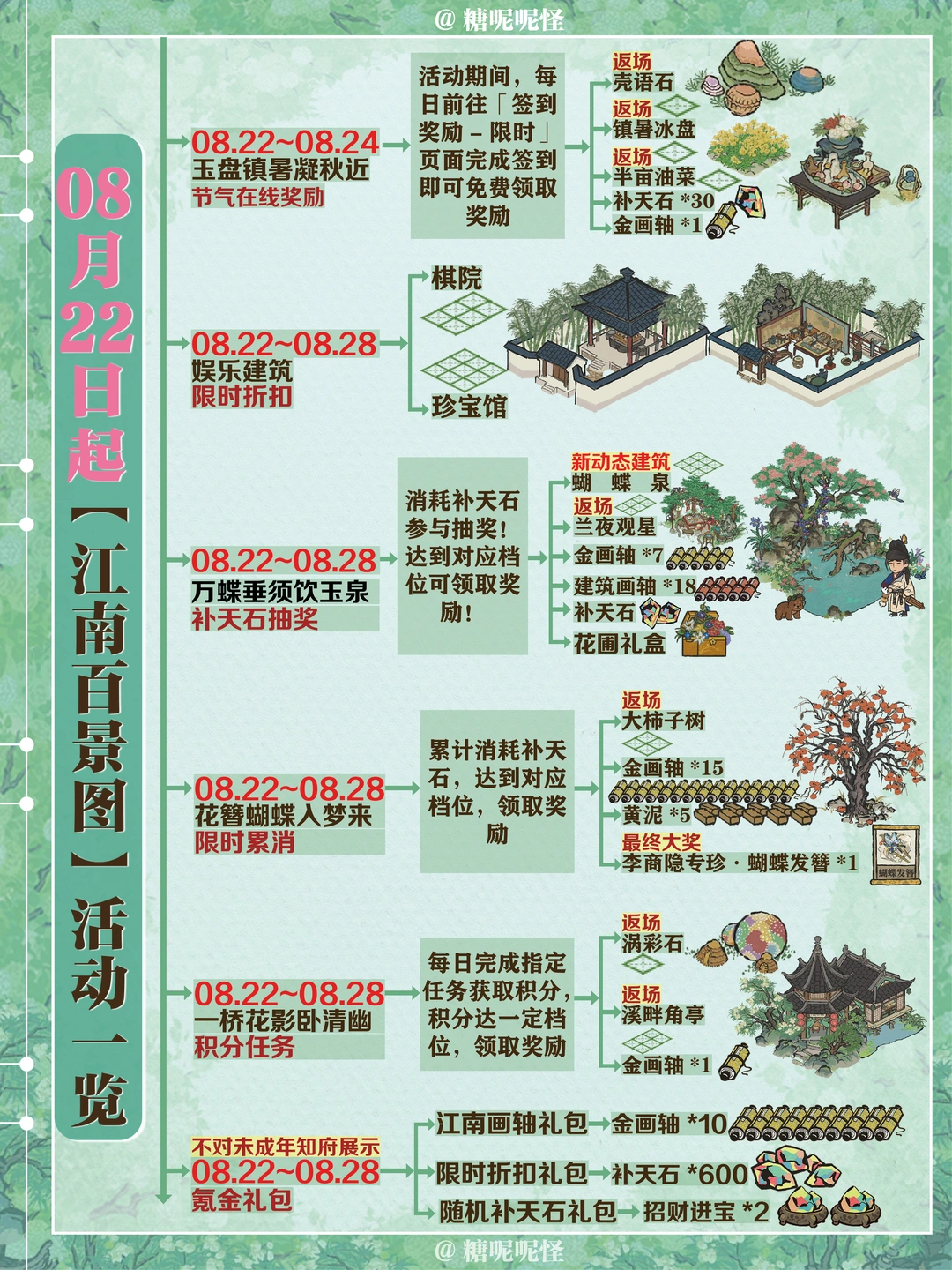 1️⃣新人物:李商隐 专珍:蝴蝶发簪 2️⃣新建筑:蝴蝶泉 3️⃣新闲人:乞巧星 4️⃣新头像:蝶意 5️⃣新头像框:蝶栖 6️⃣返场人物:宋沉吟 余妙年 7️⃣返场小动物:幼熊 戴胜 8️⃣返场建筑:大柿子树 溪畔角亭 兰夜观星 鹊影桥 最相思 亭亭枇杷