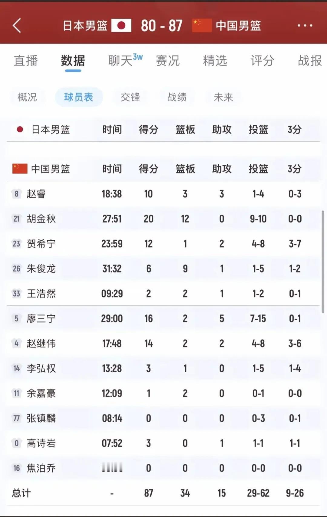 男篮能够在客场击败日本,郭士强还得感谢两位新入选的,一个贺希宁一个赵继伟。 贺希宁通过联赛高光表现,证明他的能力,劲头十足,强壮如牛,有一股子不服输精神,赵继伟传统控卫,能够调度,能使球队整体进攻有序。 先前国手方面胡金秋能力全面,以后国家队锋线中流砥柱,廖三宁进步明显,赵睿有队长担当,朱俊龙九个篮板说明不可或缺。 国家队人才是有的,只有郭士强不拘一格降人才,不要迷恋于那些所谓大牌,在亚洲实力还是数一数二的。 通过这场比赛,希望郭士强以后长点记性,两负韩国就是选人不得力导致,希望接下来高歌猛进,打进世界杯奥运会。