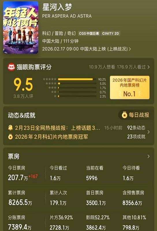 韩延新片7分,春节档票房倒数第一。 你肯定看过他的《滚蛋吧!肿瘤君》《送你一朵小红花》,部部卖座又催泪。 这次他砸730天做视效,画8000张概念图,14万帧镜头堆出92%的视效占比。 换做是你,在57.52亿的春节档只卖8057万,这口气咽得下吗? 首日排片还够看,后来直接掉到4%以下,全是早场深夜的边缘场次。 排片低→票房低→排片更低,死死卡进恶性循环。 去年《蛟龙行动》也是这结局,大制作最后垫底撤档。 一开始主创怪排片,后来才认,是观众适配度不够。 你掰着手指头数春节档爆款:喜剧、动画、系列续作,全是合家欢。 这部原创科幻没IP打底,跟团圆氛围不搭,就算豆瓣开7分,也拉不动全家进影院。 主演降薪支持视效,韩延路演时反复说,总要有人尝试不一样的事。 好口碑没在早期攒够势能,连逆转排片的机会都没捞到。 赚快钱的路挤破头,趟新路的人先吃土。